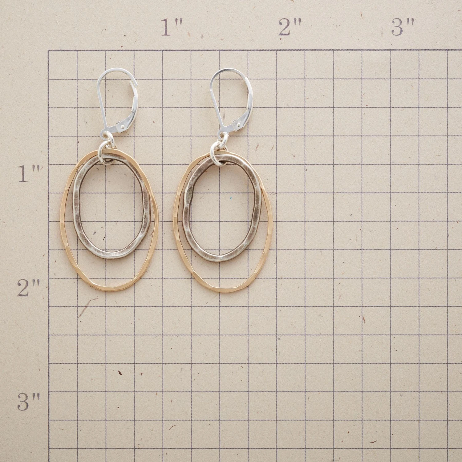 Each 14kt gold-filled oval encircles another of sterling silver, both hand-hammered. Two-tone double loop earrings made in USA with sterling silver lever back wires. Exclusive. 2″L.