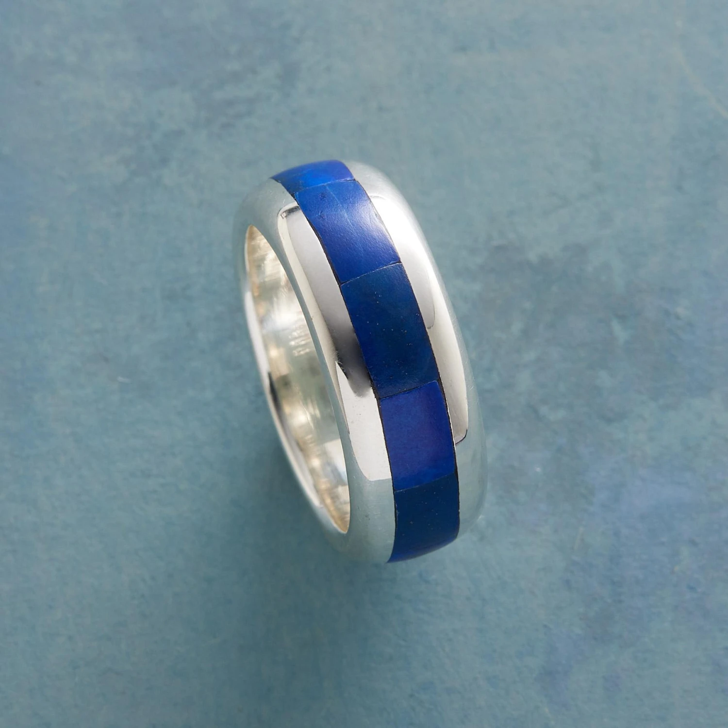 Immediately recognizable by its deep blue hue, hand cut lapis encircles our sterling silver band, expertly inlaid for a smooth finish. Exclusive. Whole sizes 5 to 13. 5/16″W.