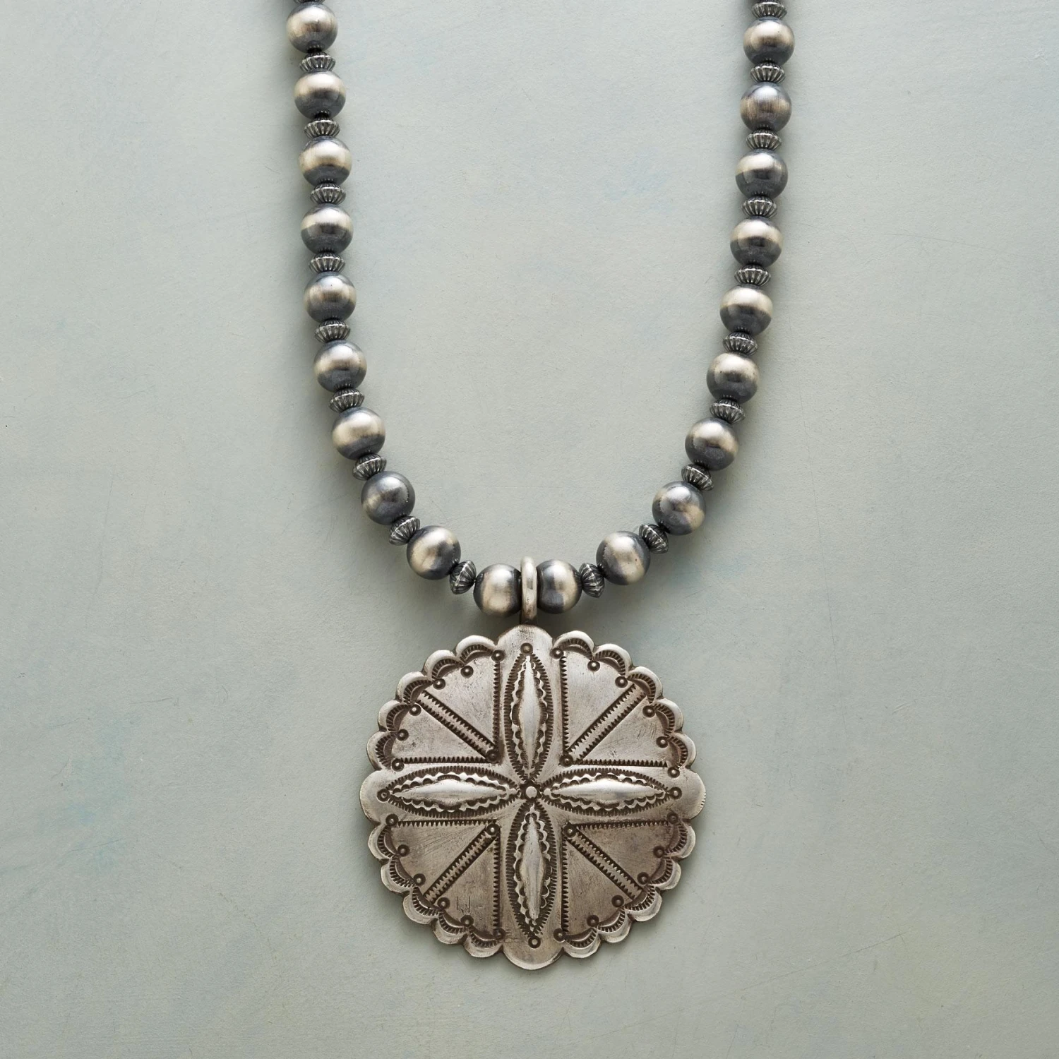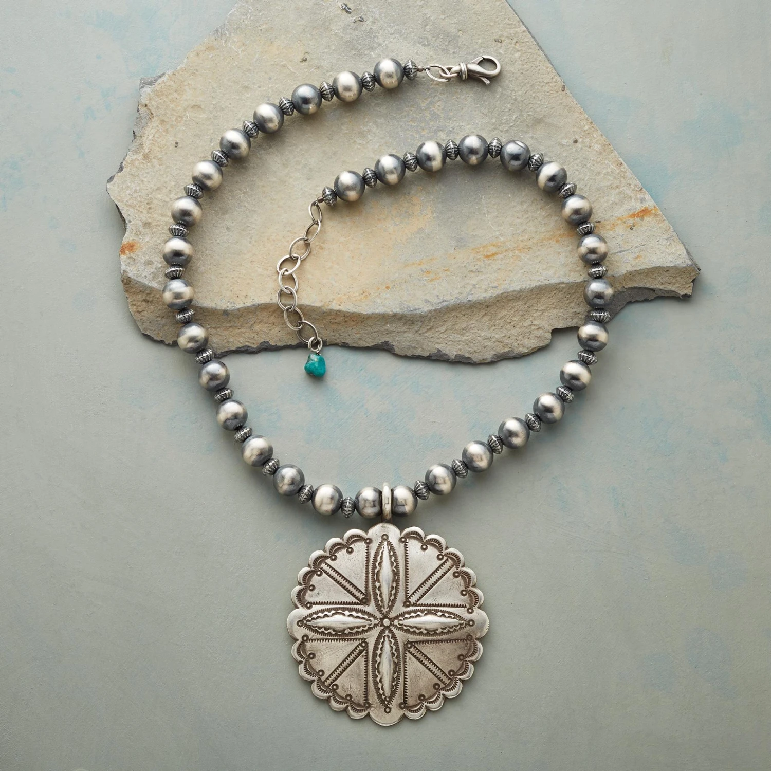 By the renowned Southwestern artist Buffalo, this sterling silver necklace melds traditional Native American silver-working techniques, including hand-stamped designs, repoussé and fluted beads, with modern elegance. Sterling lobster clasp with turquoise accent. USA. Exclusive. 19″ to 20-1/2″L x 3/8″W chain, 2-3/8″ dia. pendant.