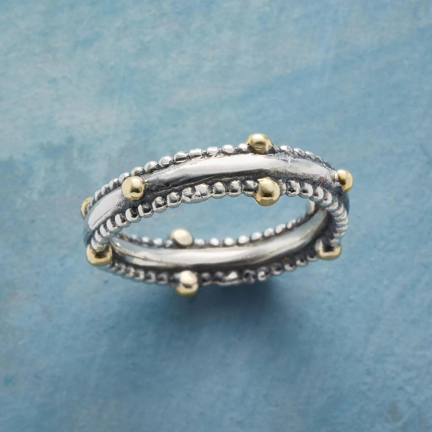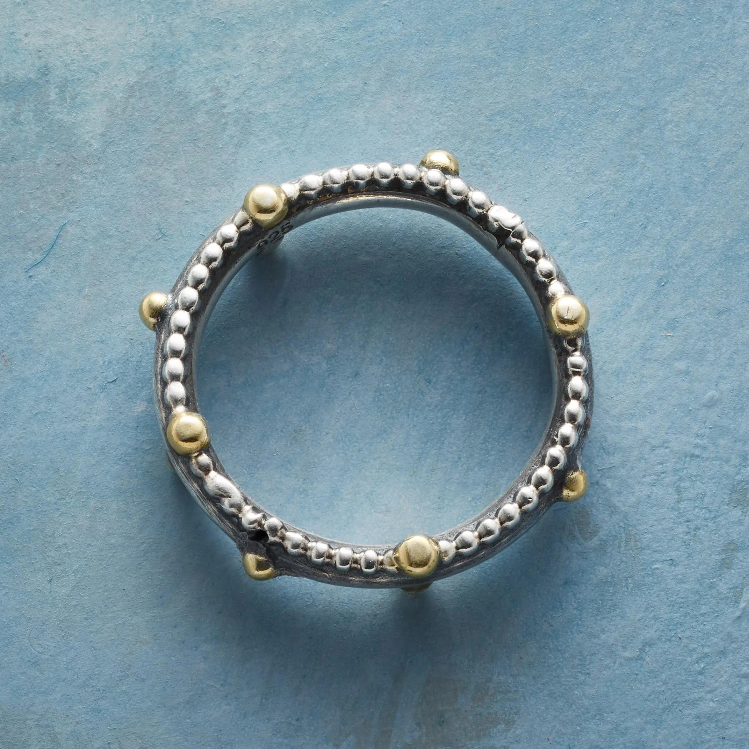 Beaded borders can’t contain an emerging pattern of larger beads brightened by 14kt gold plate. Exclusive. Sterling silver. Whole sizes 5 to 10.
