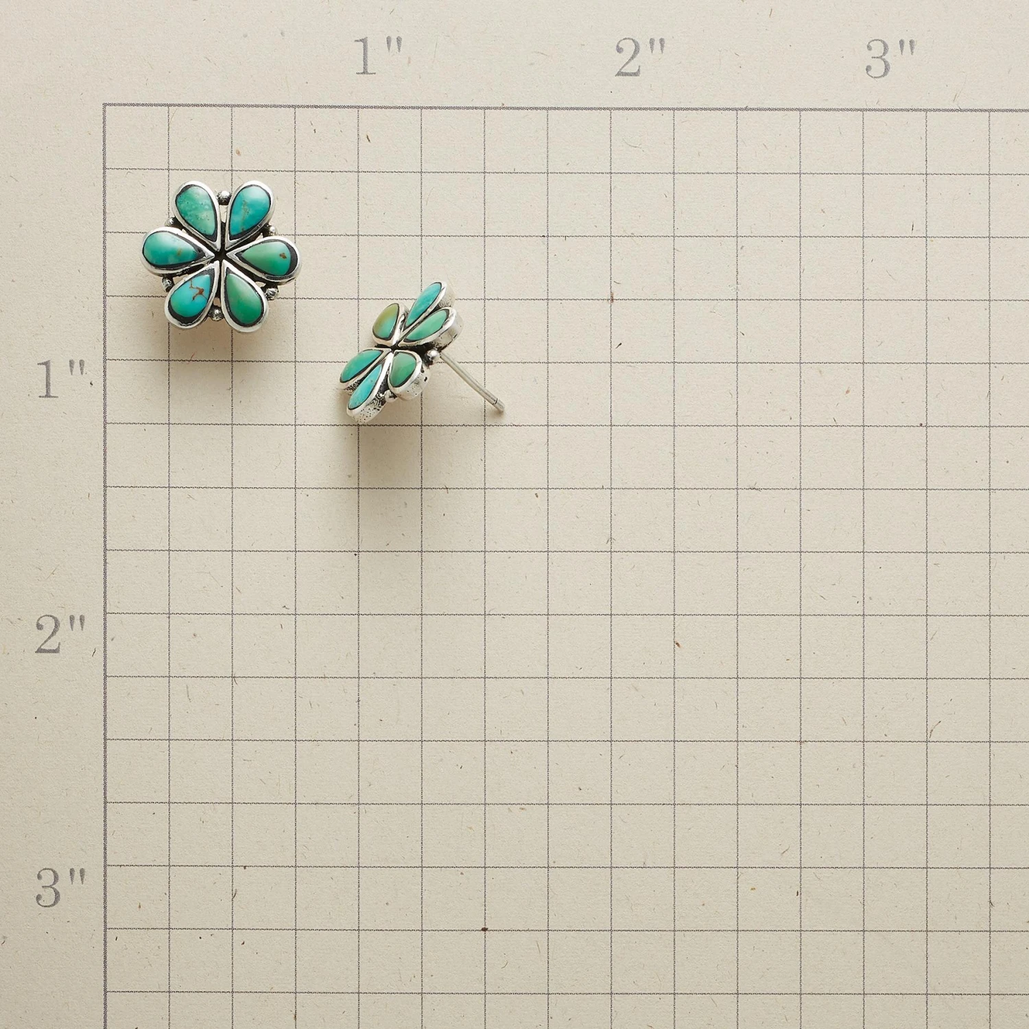 Sterling silver petals inlaid with turquoise make a sweet statement with great graphic punch. Sterling posts. Handcrafted. Exclusive. 5/8″ dia.