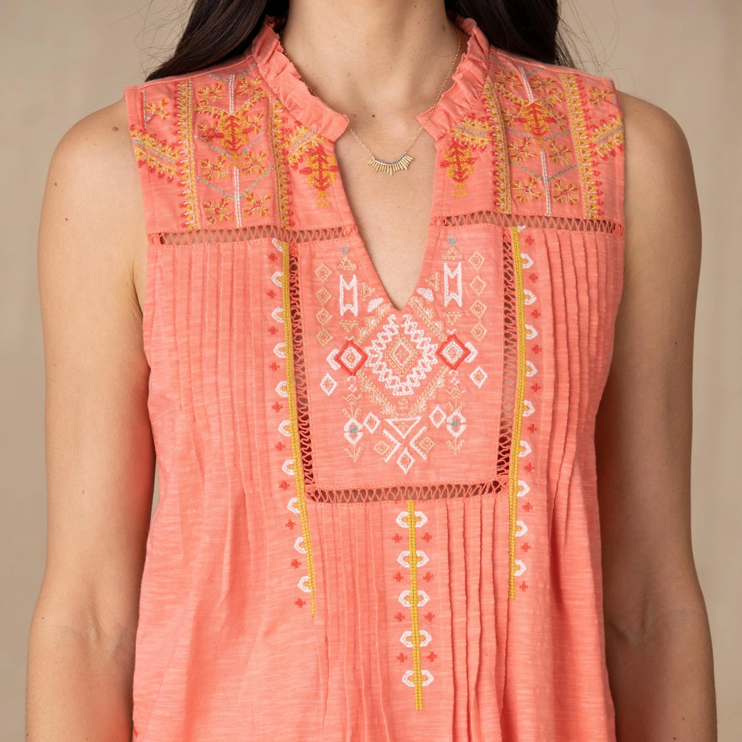 Flowing, A-line top in soft cotton slub with notch neckline, geometric embroidery, ladder lace inserts, pintucks, raw-edge ruffle detail and side slits. Machine wash. Imported. Exclusive. Sizes XXS (00), XS (0 to 2), S (4 to 6), M (8 to 10), L (12 to 14), XL (16 to 18). Approx. 25″L.
