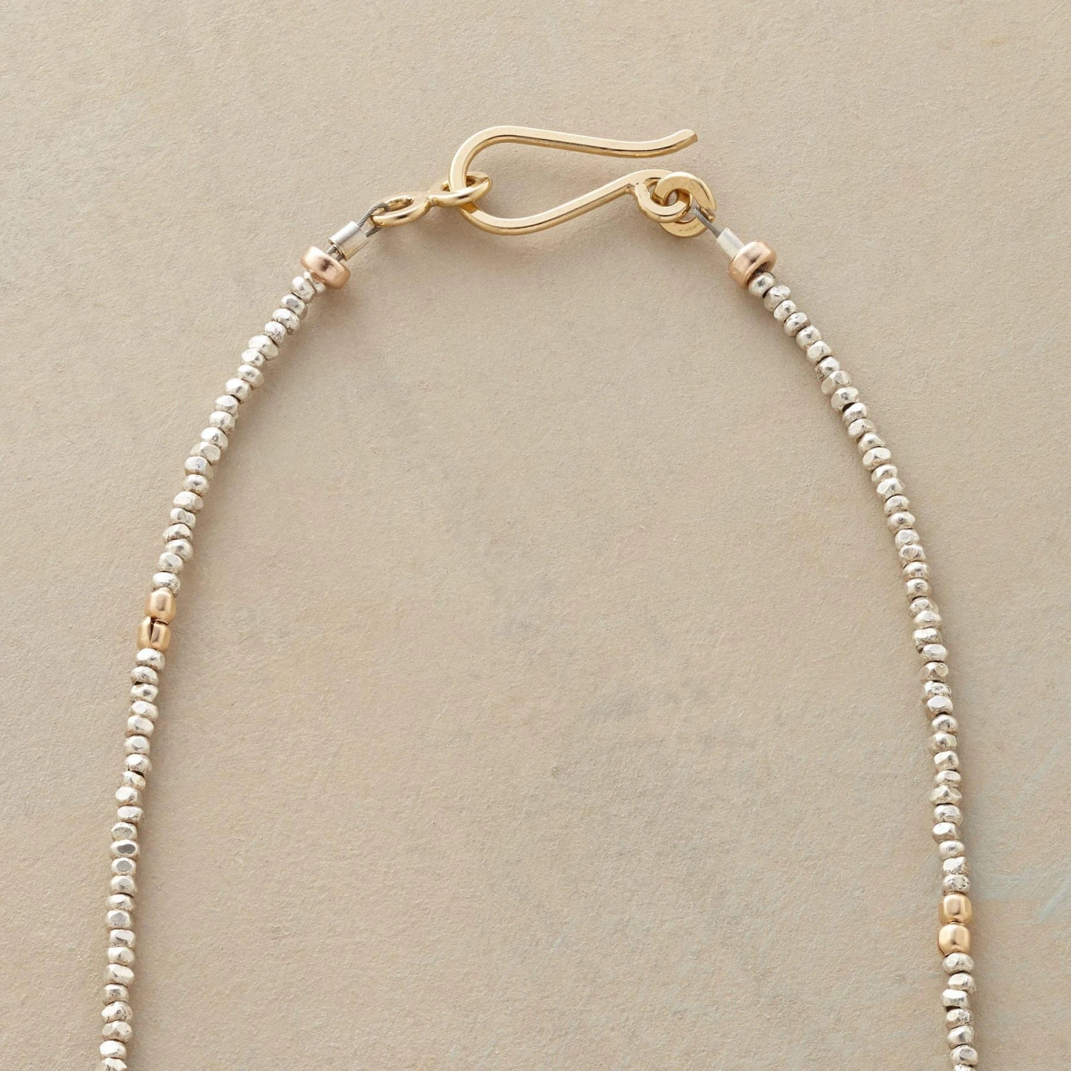 The carved look of our cross is a result of hand-hammering. Its 14kt goldfill is reflected in beads scattered among others of sterling silver. Hook clasp. Exclusive. Made in the USA. 17″L.