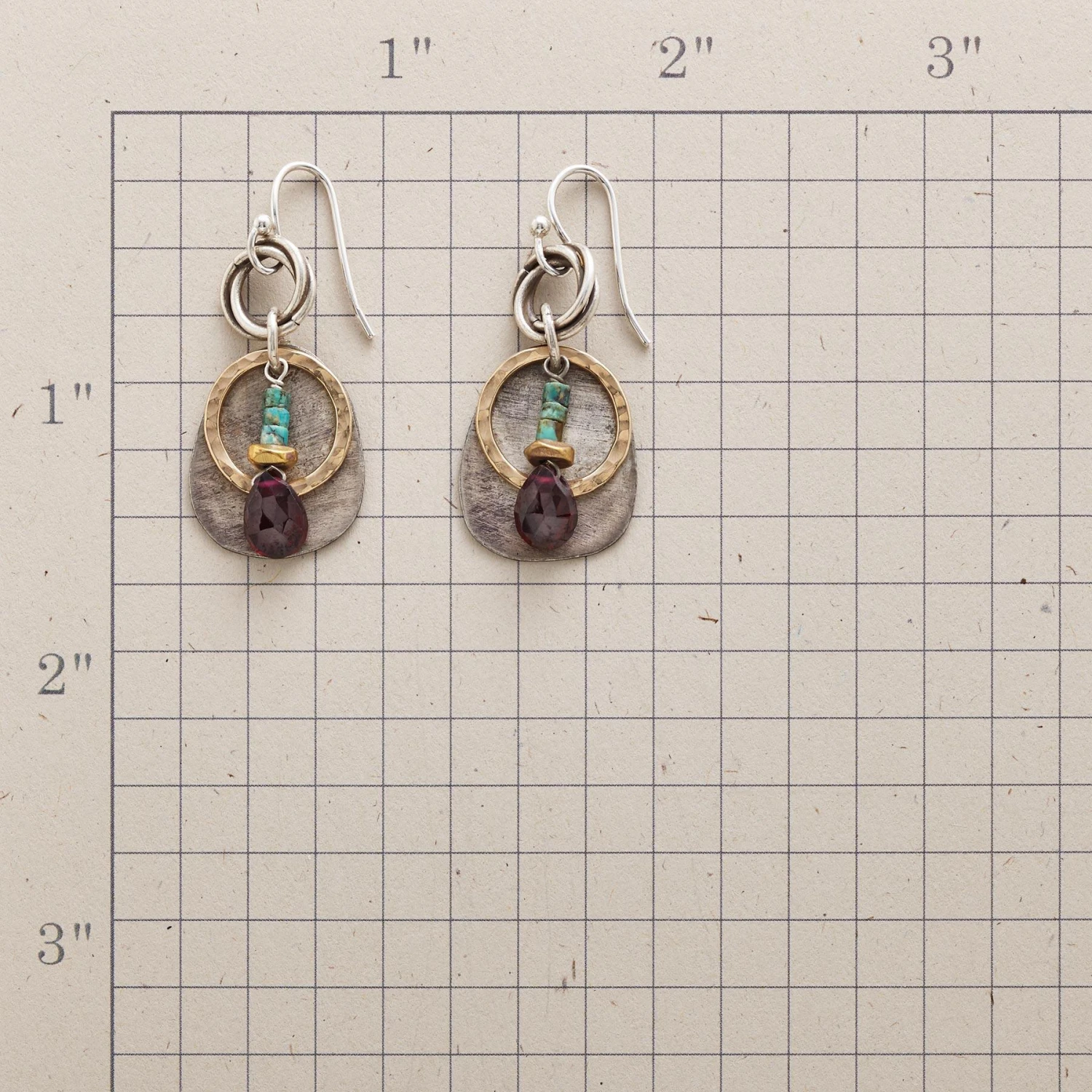Mixed metals—24kt gold plate, brass and sterling silver— mingle in these turquoise and garnet earrings. Sterling wires. USA. Exclusive. 1-1/2″l.