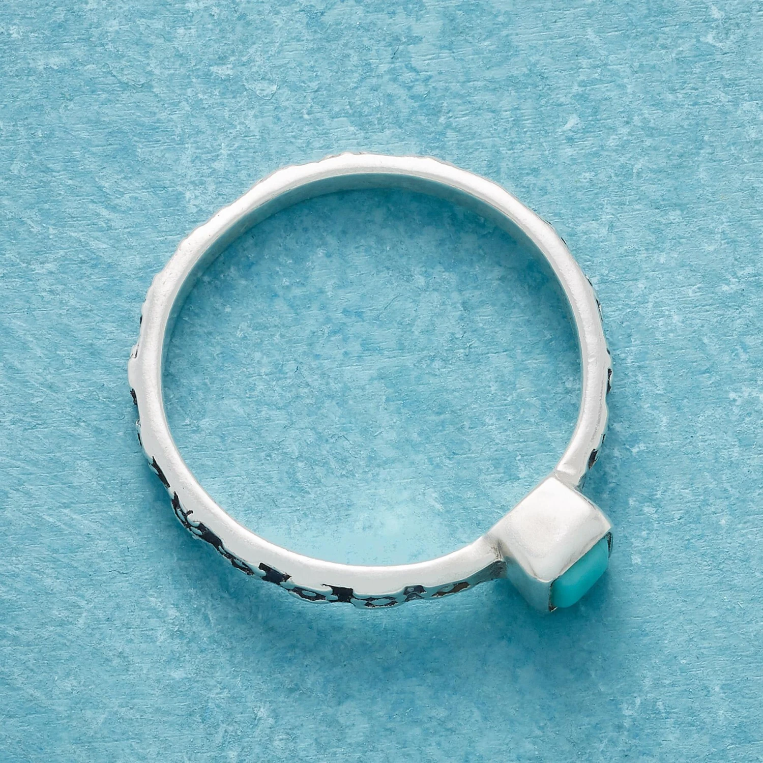 Like a fragment of blue sky, a turquoise cabochon rises from a band covered with sculpted flowers. Handmade of sterling silver. Whole sizes 5 to 10.