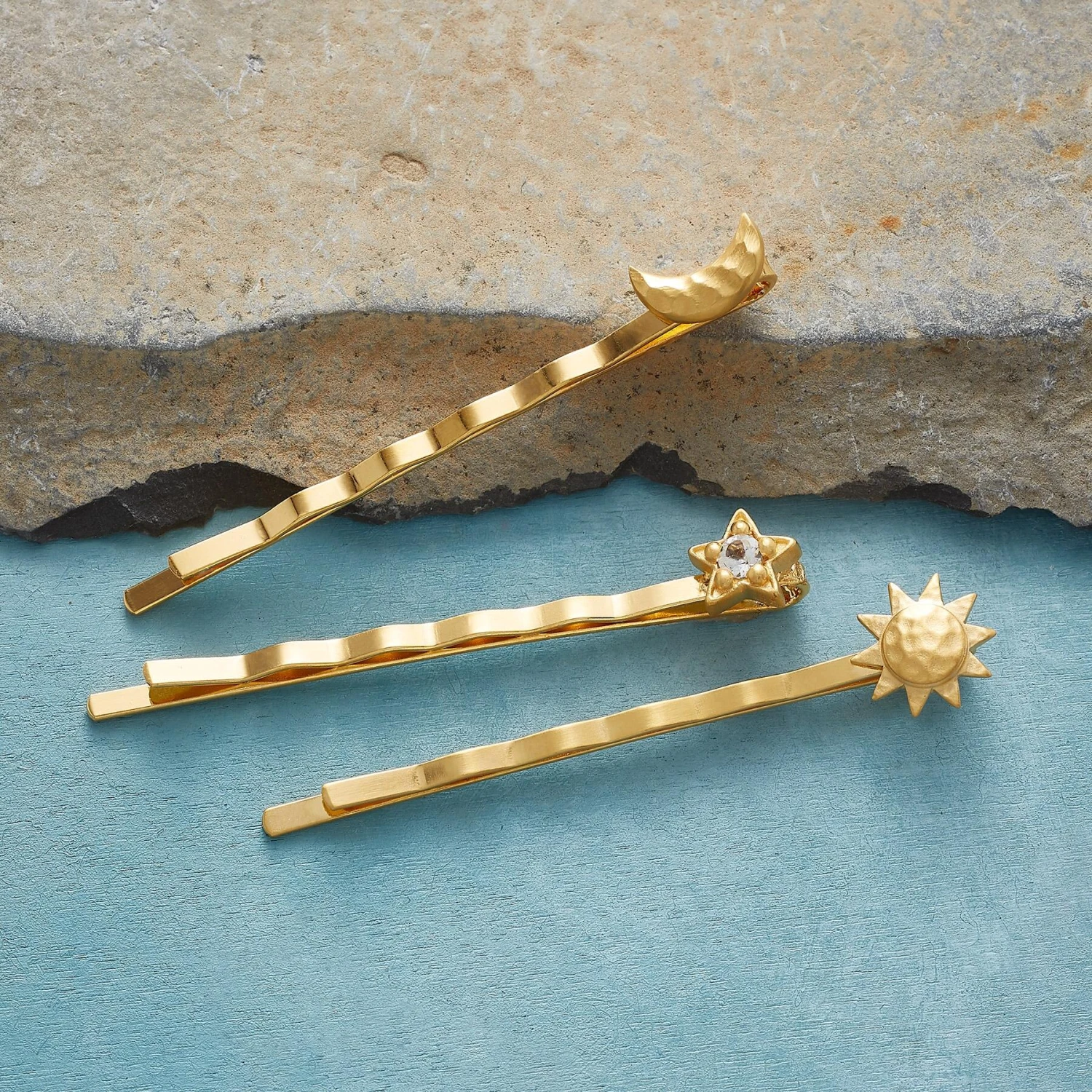 Heavenly ornamentation for your tresses, handcrafted of 18kt gold plate and sparkling with a starry white topaz. Approx. 2″L. Set of 3.