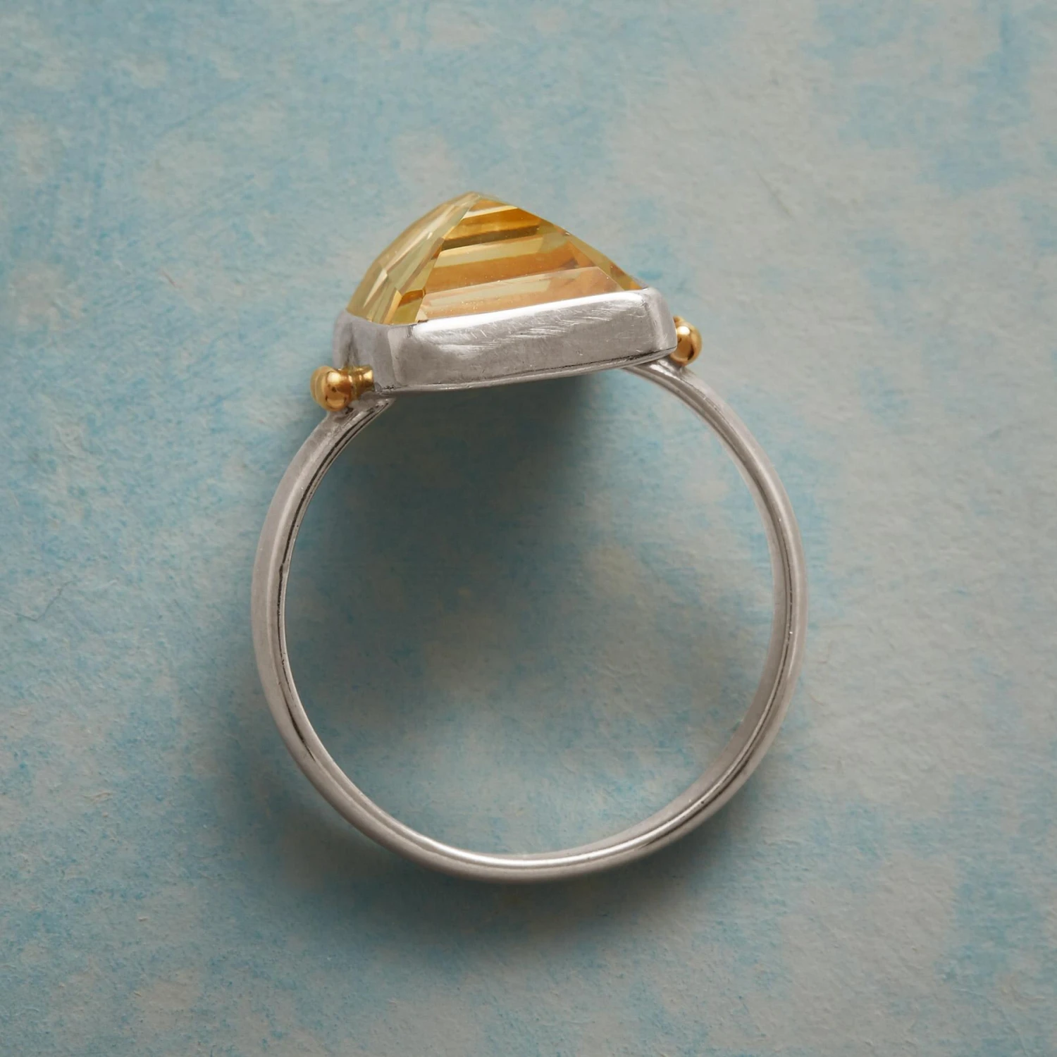 A sterling silver bezel and two pairs of 14kt gold plated accent balls highlight the luminescence of a radiant citrine. Handmade. Exclusive. Whole sizes 5 to 9.