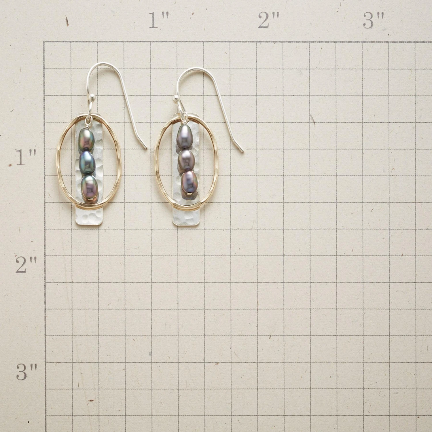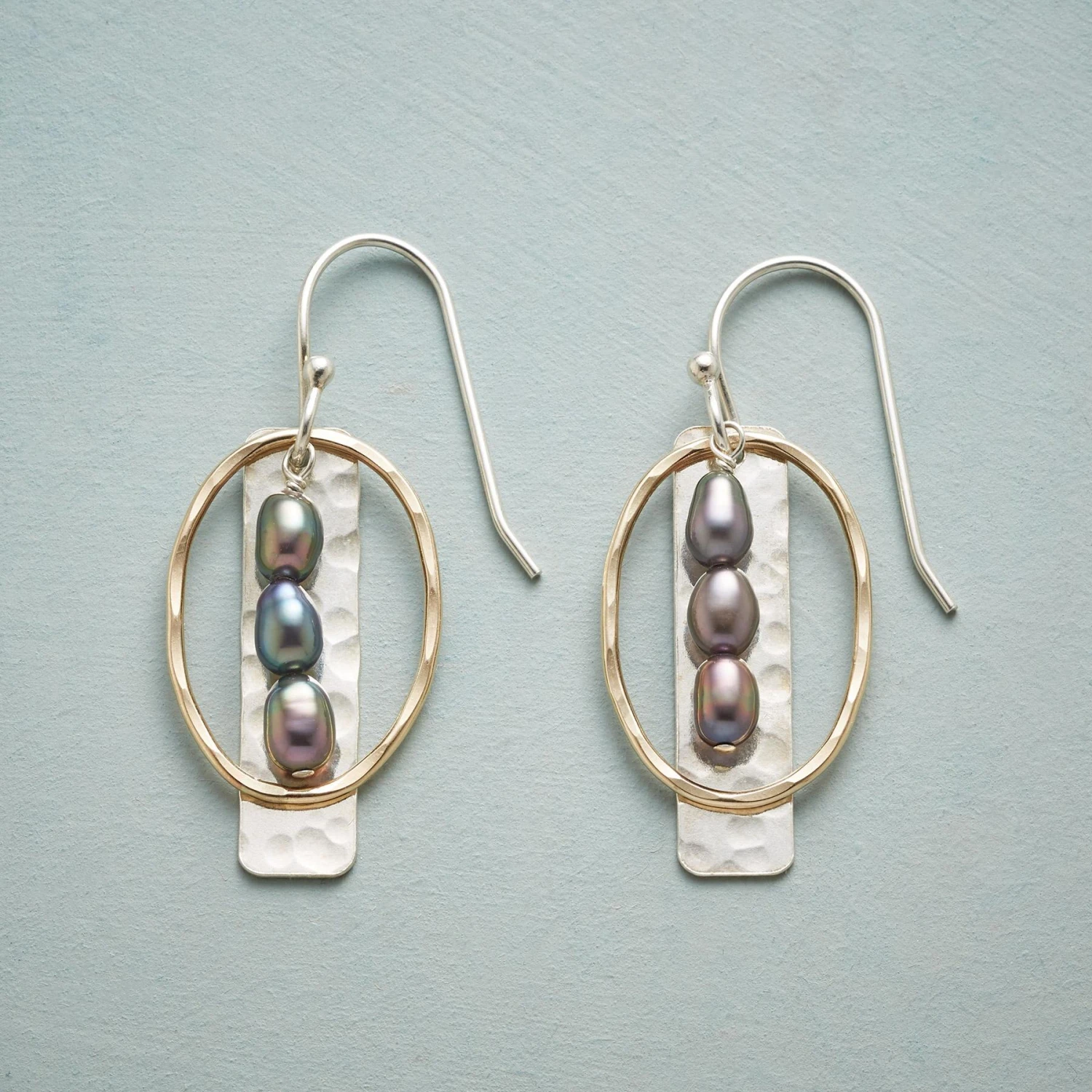 Three cultured, freshwater pearls, tinted a stormy gray, line up within 14kt gold-filled ovals, while hammered sterling silver reflects on their beauty. Sterling wires. USA. Exclusive. 1-1/2″l.