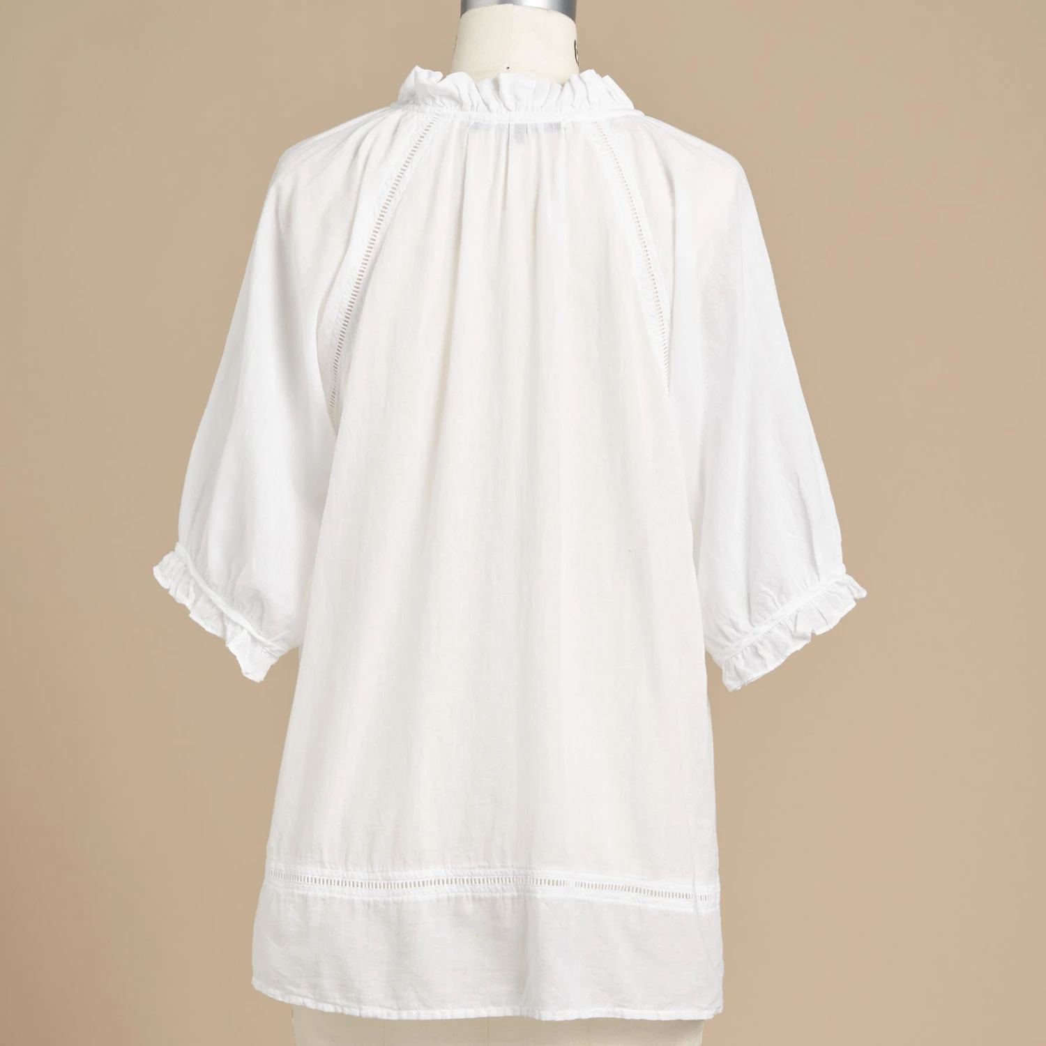 Elegant, easy-fit blouse, beautifully detailed with hand embroidery, ladder lace, ruffle collar and mother-of-pearl buttons. Cotton. Hand wash. Imported. Sizes XS (4), S (6), M (8 to 10), L (12), XL (14). Approx. 25-1/2″L.
