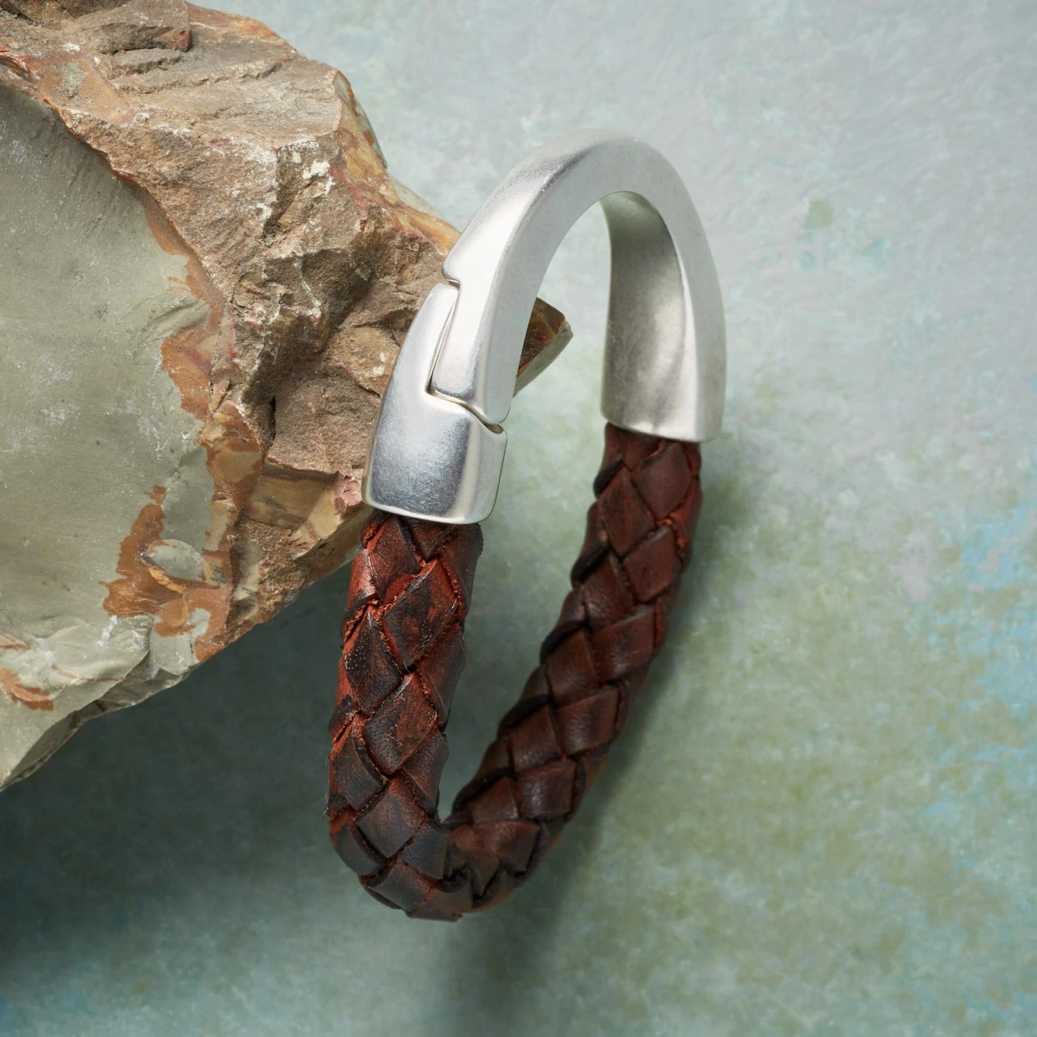 Supple hand-braided leather is rounded out with an arc of sterling silver in a bracelet that complements jeans or a jacket with equal aplomb. Magnetic closure. Handmade in USA. Approx. 2-1/2″ dia.