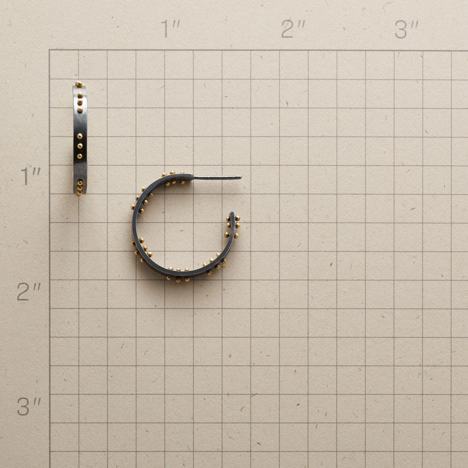 Dots hand crafted of 18kt gold line up three by three, their pathway a pair of sterling silver hoops oxidized to night-dark black. Posts. Handmade in USA. 7/8″ dia.