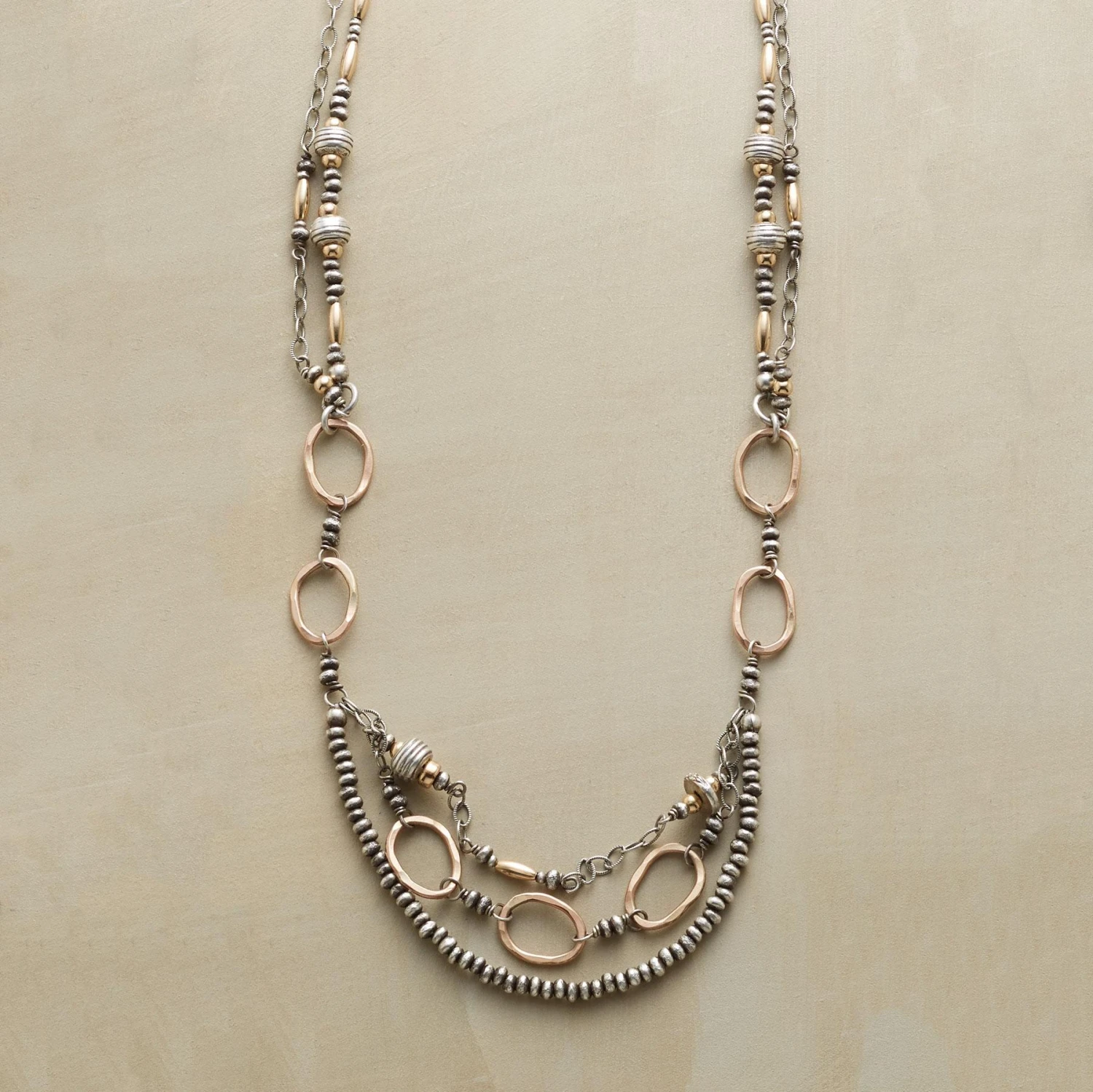 Smart on every level, this necklace complements all with its mix of 14kt gold-filled and sterling silver links, beads and baubles. Sterling silver clasp. USA. Exclusive. 18″-20″l.