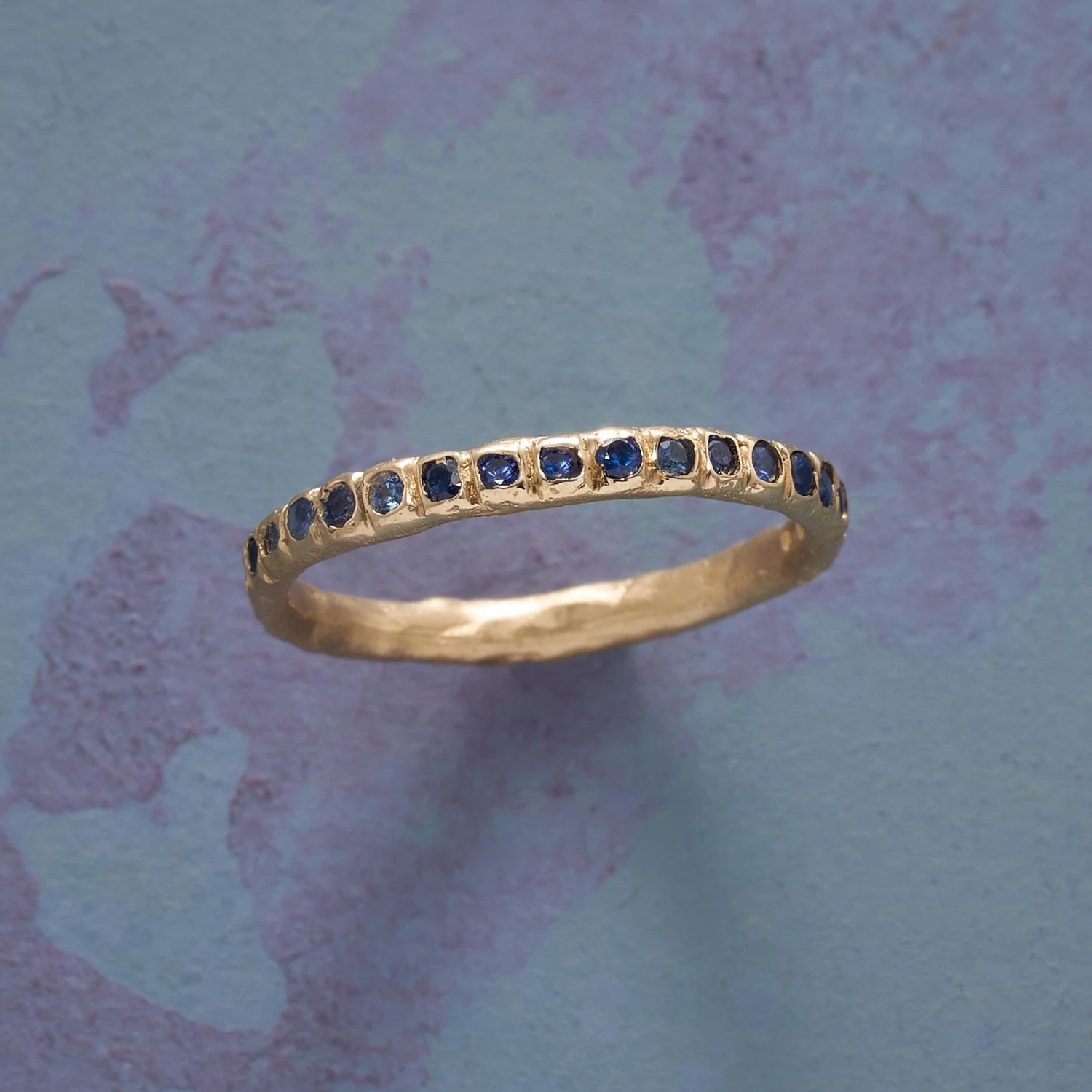 Ruth Tomlinson hand-selected and arranged every sapphire in her 14kt yellow gold eternity ring to bring out the beautiful blues of each stone. Richly organic and elegantly simple, the ring is handcrafted. Whole sizes 5 to 9.
