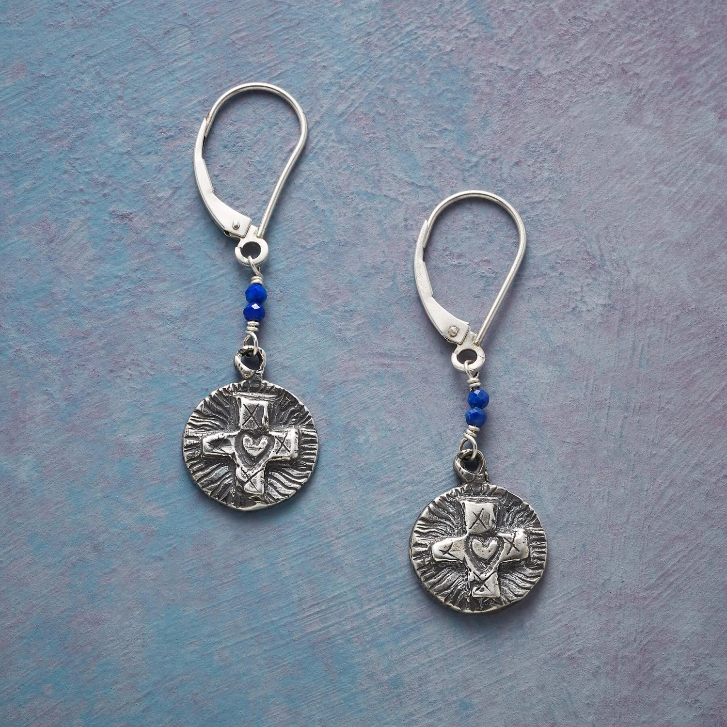 A bas-relief cross centered on a heart hangs below midnight blue lapis as a reminder that faith and love prevail through dark of night. “Have faith” on reverse. Exclusive. Handmade in USA by Jes MaHarry. Sterling silver. French wires. 1-5/8″L.