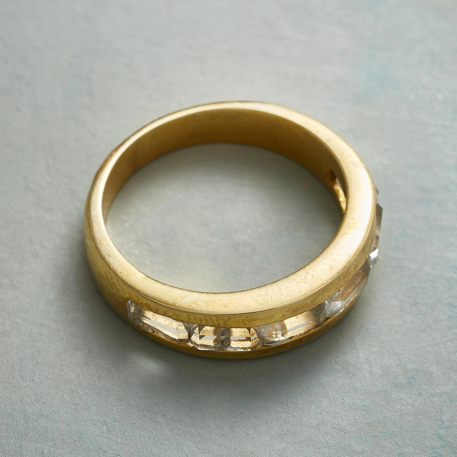 Six white topaz baguettes line up in a channel of 22kt gold-plated sterling silver, for a sparkle that’s equal parts ice and fire. Handmade. Exclusive. Whole sizes 5-10.