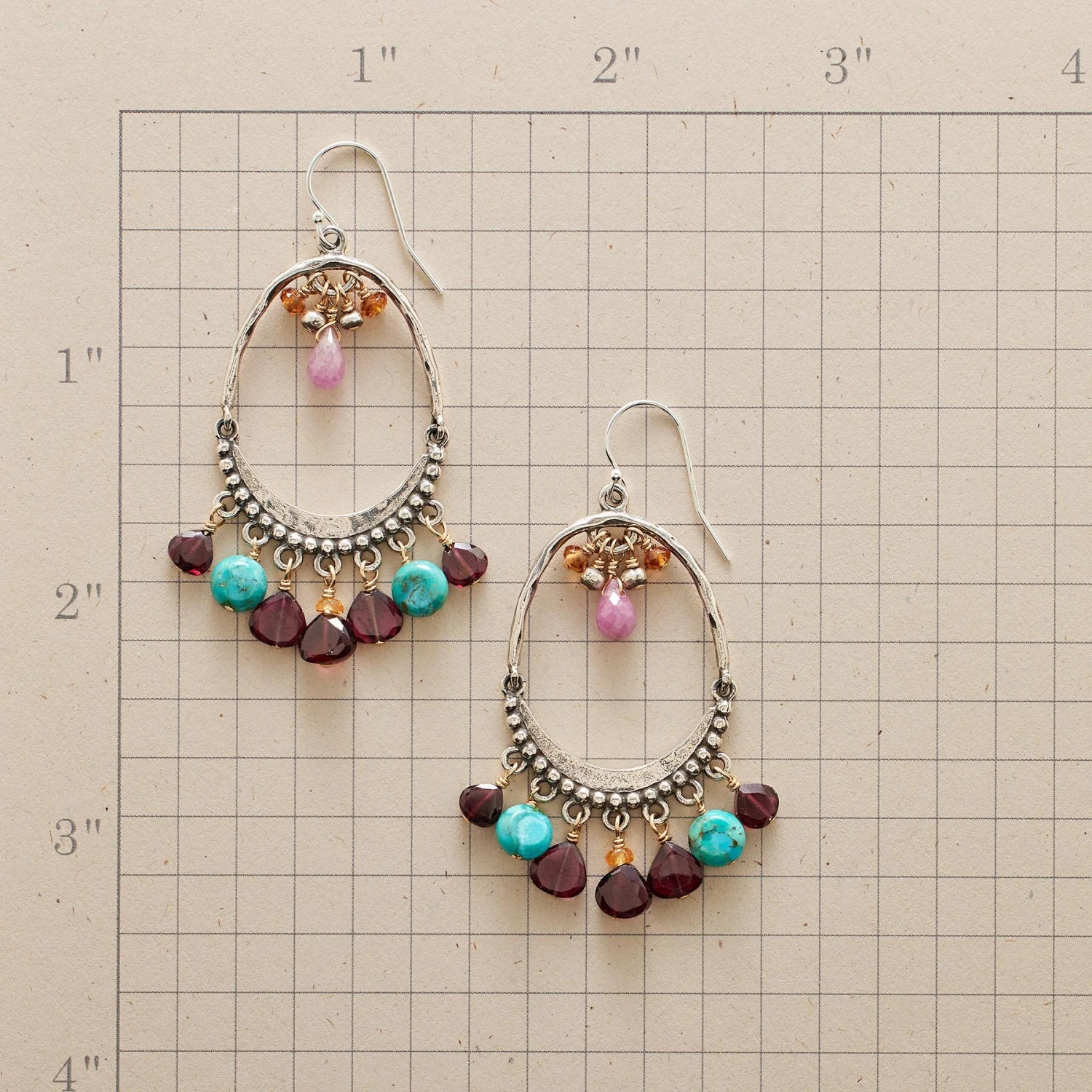 Swinging beneath pink sapphire-jeweled arcs, beaded crescents flutter with turquoise and garnet drops. Sterling silver with Thai silver accent beads. French wires. Handmade in USA. Exclusive. 2-1/4″l.