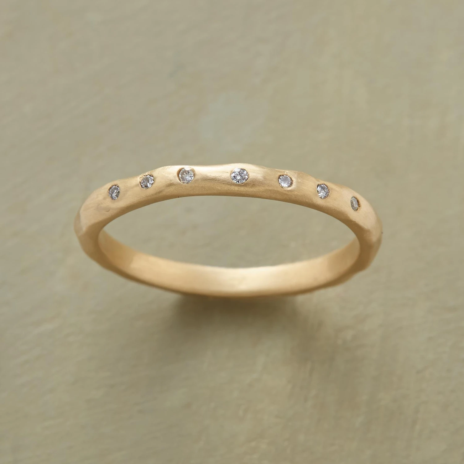 Seven delicate diamonds decorate the finger in this gold diamond band, with points of light emerging from matte-finished 14kt gold. Kyoko Honda’s slender, irregular, hammered band is handmade in USA. Whole sizes 5 to 9.