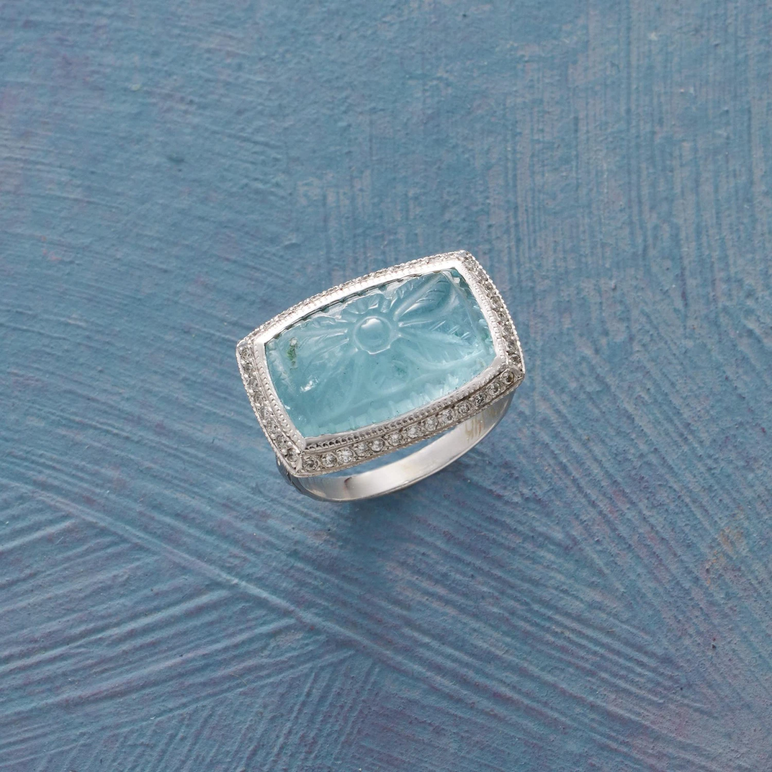 Exuding romance, inviting admiration. This one-of-a-kind carved aquamarine ring is set with brilliant white diamonds on a rectangular 14kt white gold band. Handmade by Julie Romanenko in the USA. Size 6. Setting 3/4″ x 1/2″.