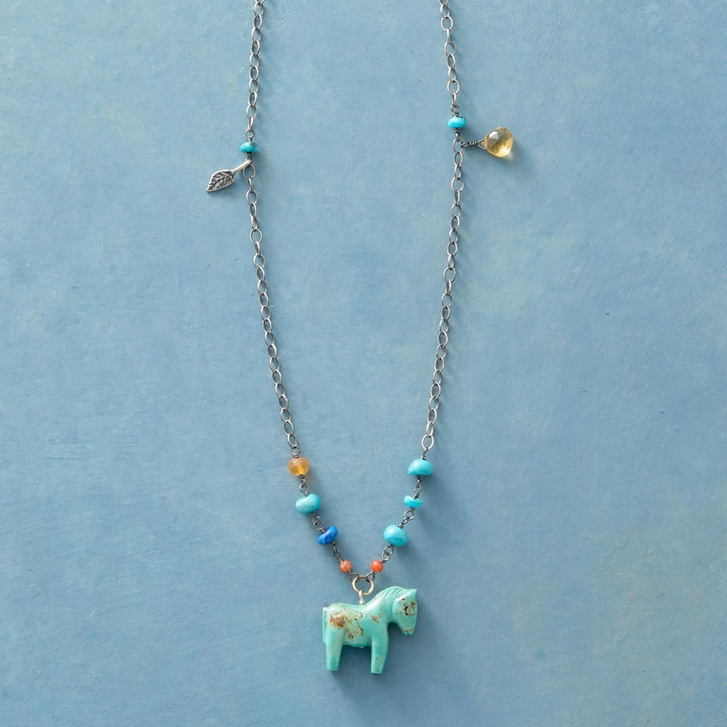 Inspired by her gypsy horse, Zephyr, Jes MaHarry crafts a necklace that salutes the wild spirit in all of us. The handcarved turquoise horse is strung on a sterling silver chain accented with coral, lapis, carnelian, citrine, aquamarine and turquoise along with a single sterling leaf. Lobster clasp. Handmade in USA. Exclusive. 18-1/2″ to 20-1/2″L, 7/8″ drop.