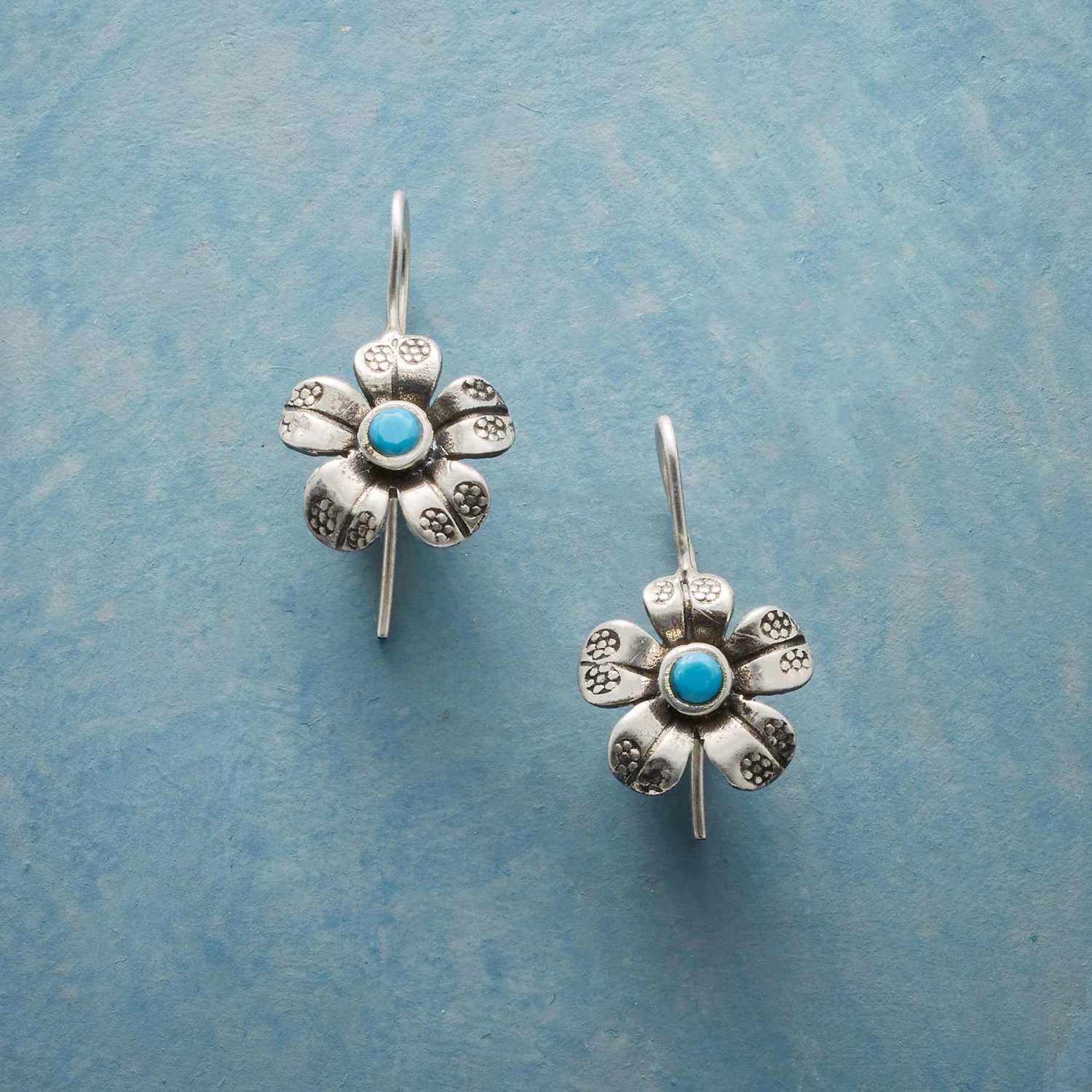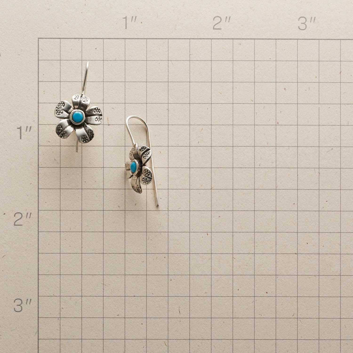Stamped petals curl with delight encircling reconstituted turquoise centers. Exclusive. Handcrafted in sterling silver, fixed to French wires. 7/8″l.