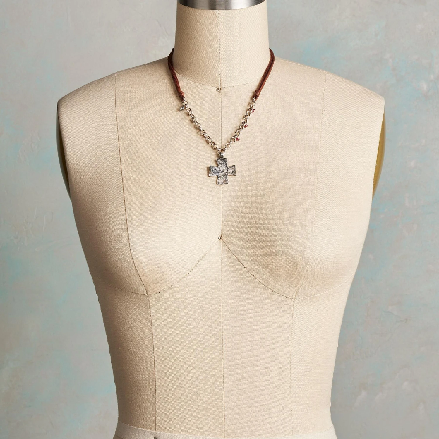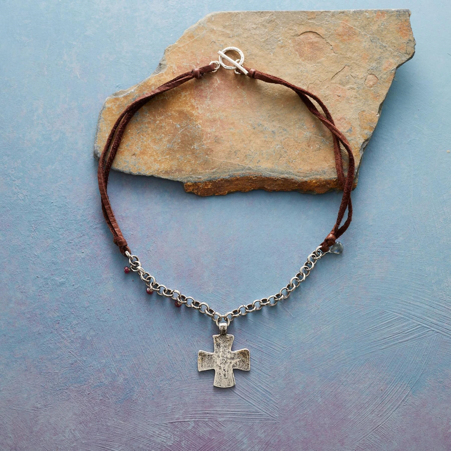 Cast from sterling silver, our cross has a rugged, earthy spirit. It’s linked to leather laces by a hand-stamped Thai silver chain, jeweled with ruby and labradorite drops. Thai silver toggle clasp. Handmade in USA. Exclusive. 17″L, 1-1/4″ drop.