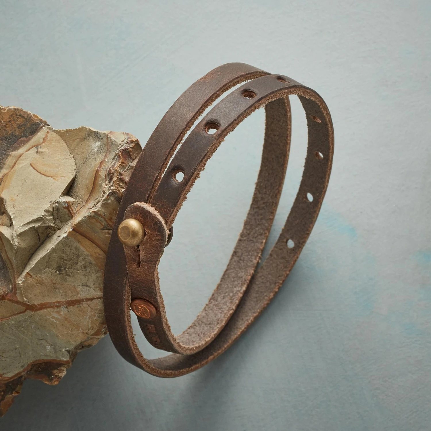 Simple, strong, enduring—a supple leather bracelet that wraps to fit and fastens with antique brass studs. Made in the USA. 17″L.