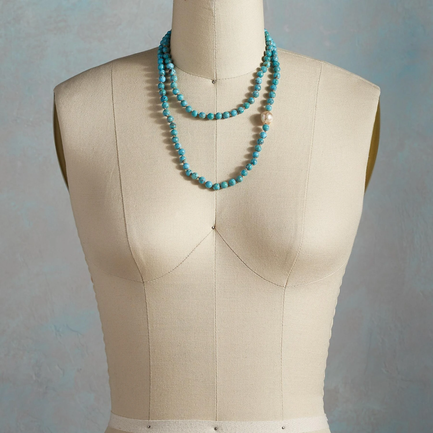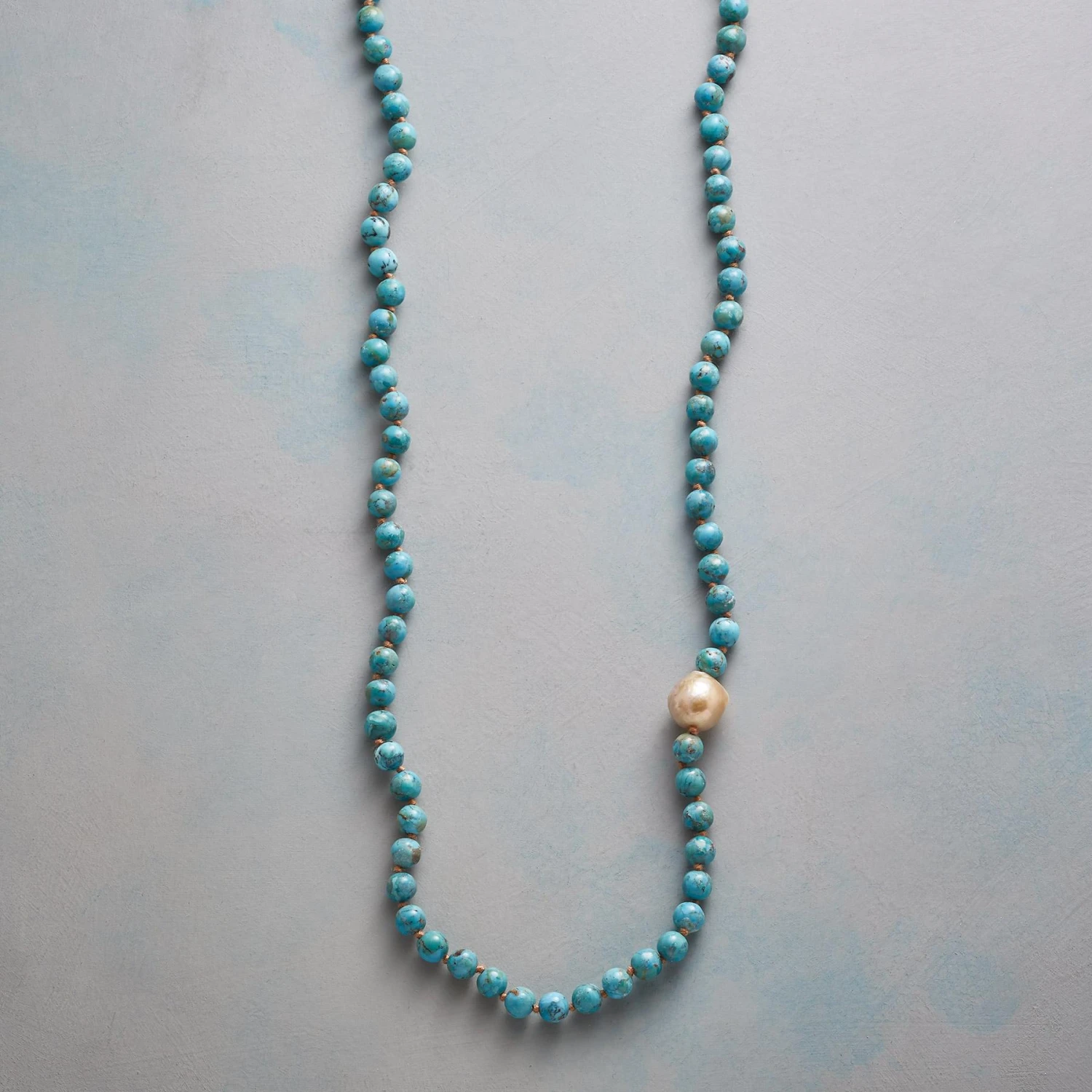 A natural freshwater pearl, tinted pink, glows like the rising sun on the horizon of Chan Luu’s compressed turquoise and copper necklace. Hand knotted on copper-colored cord with a sterling silver hook clasp. 40″L.