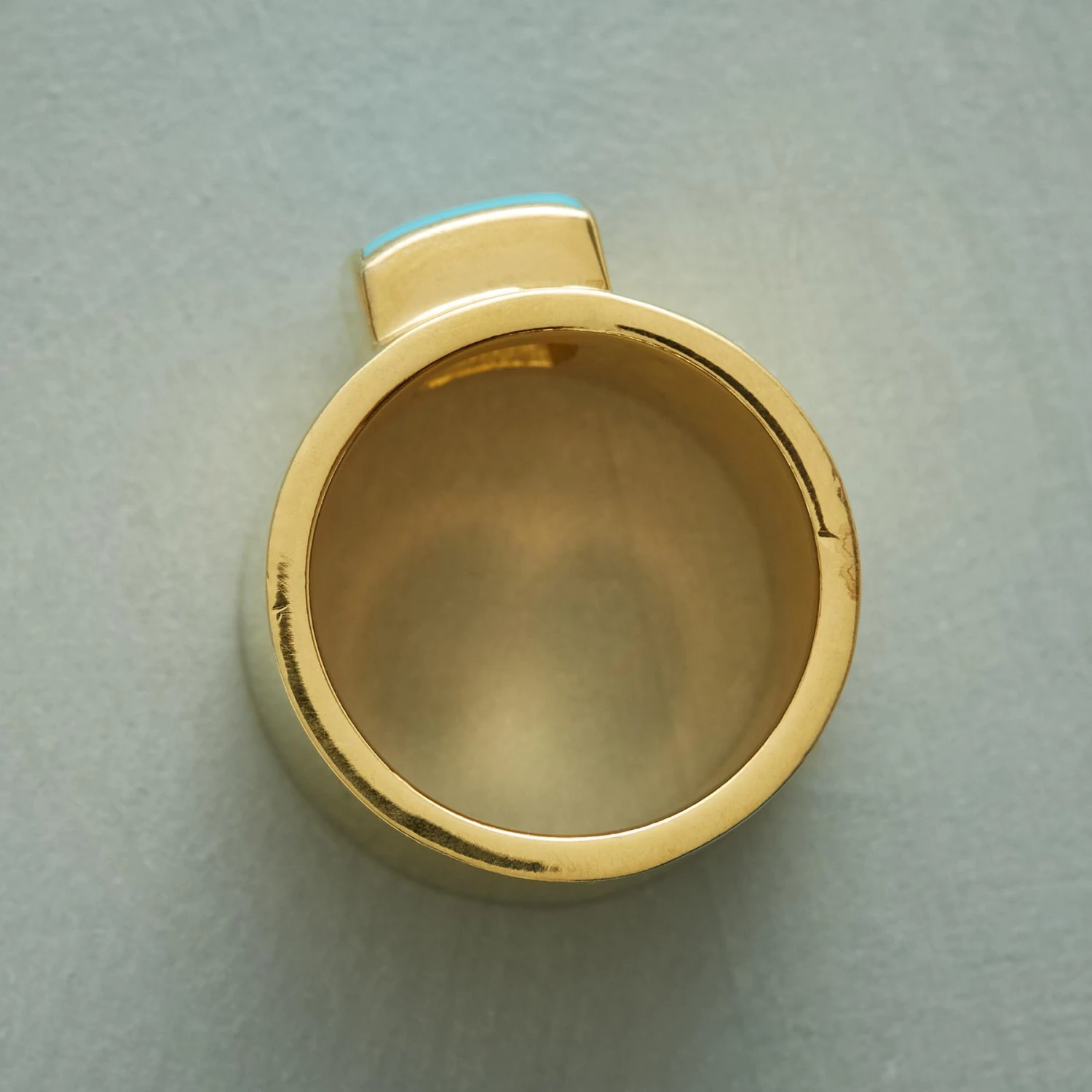 Modern art in a wide 22kt gold vermeil ring holding a square of sky blue turquoise. Exclusive. Whole sizes 5 to 9. 1/2″W.