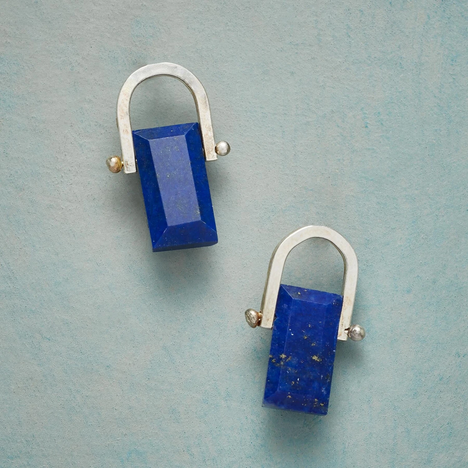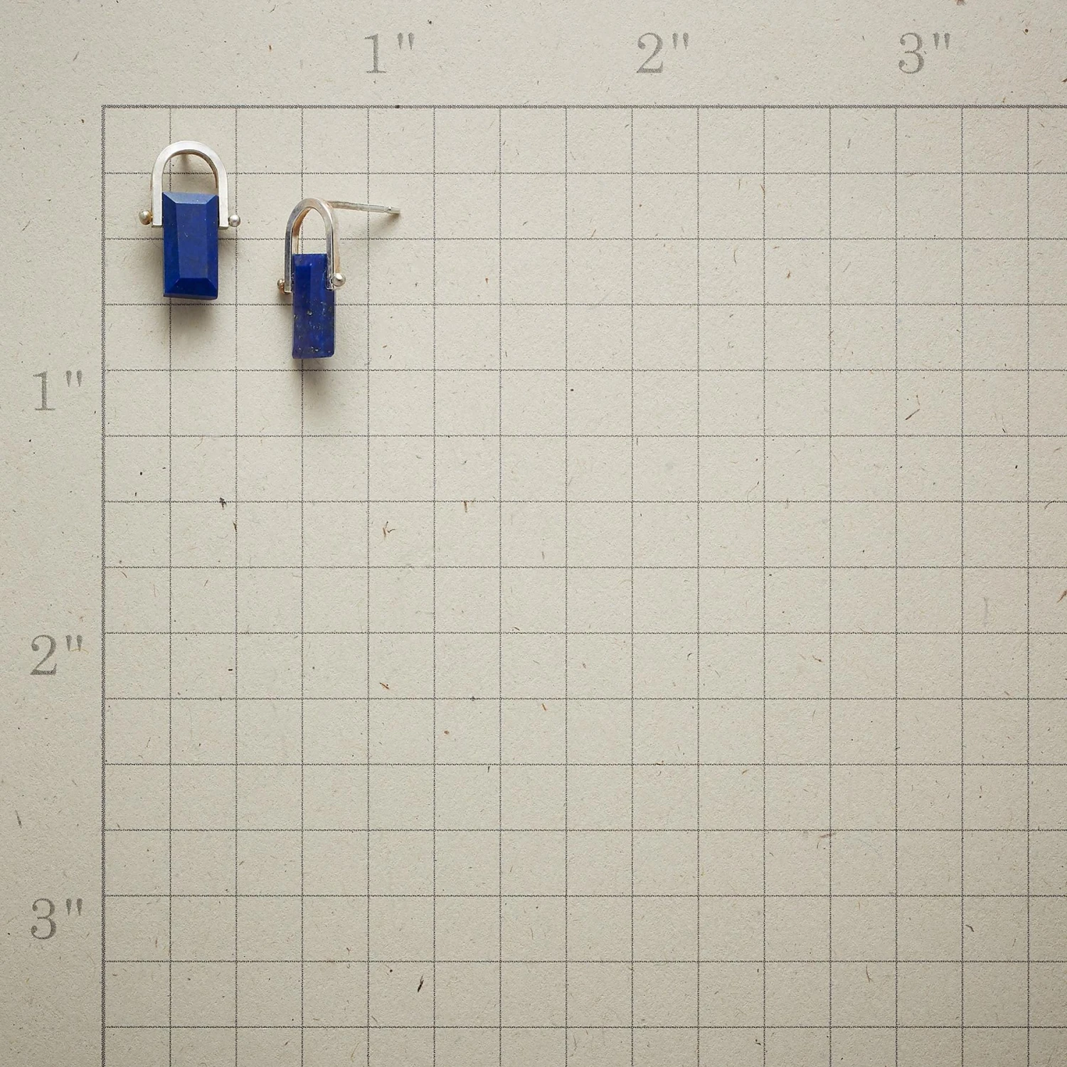 Rectangular lapis pivots on a pin pierced through a sterling silver pergoloa. Exclusive. Handcrafted in USA. Posts. Approx. 1/2″L.