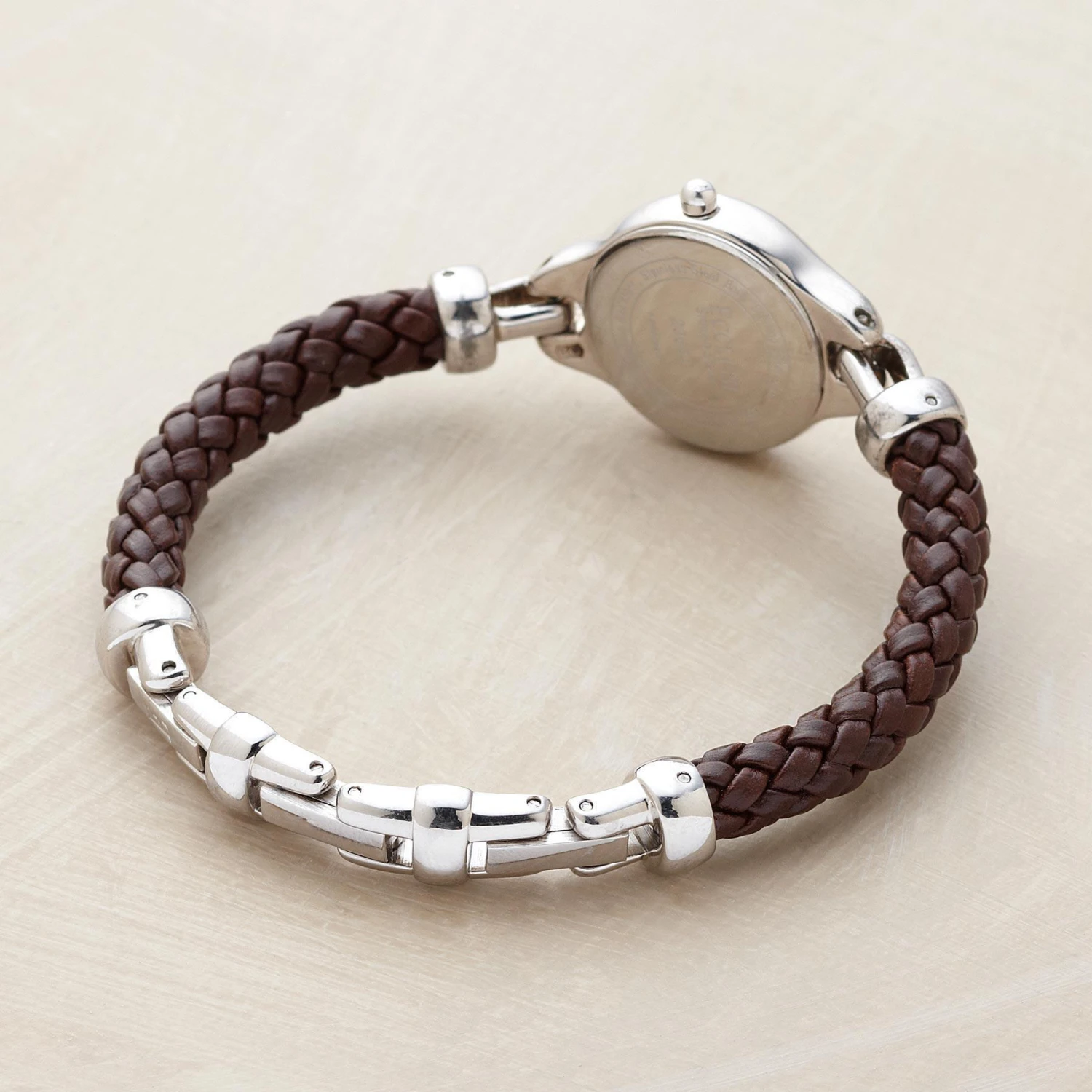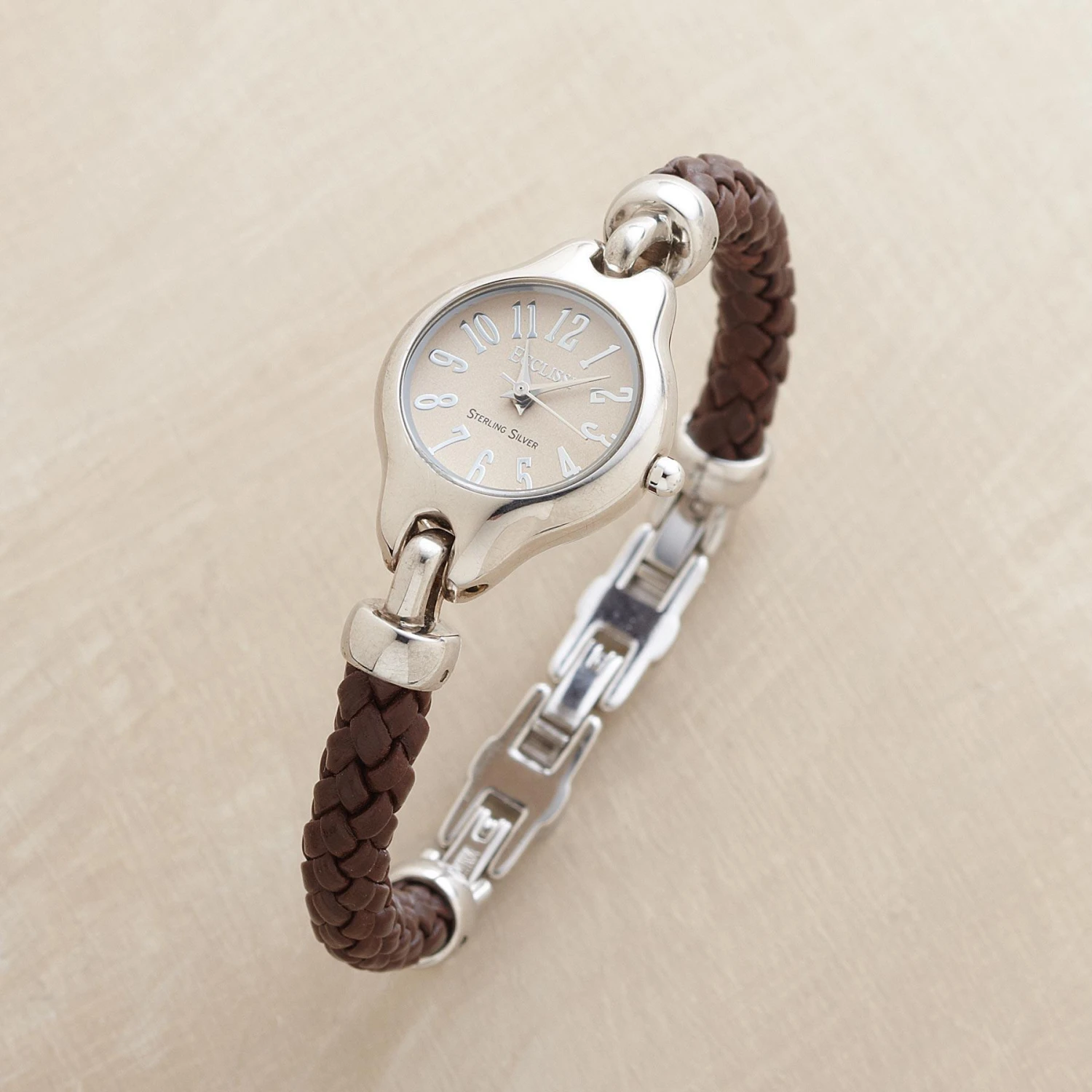 Treading the line between bracelet and timepiece, our exclusive sterling watch is linked to a braided leather band. Quartz movement; sweep second hand. Secure, fold-over clasp. Fits 6-1/4″ to 7-1/2″ wrists; 7/8″ dia. case.