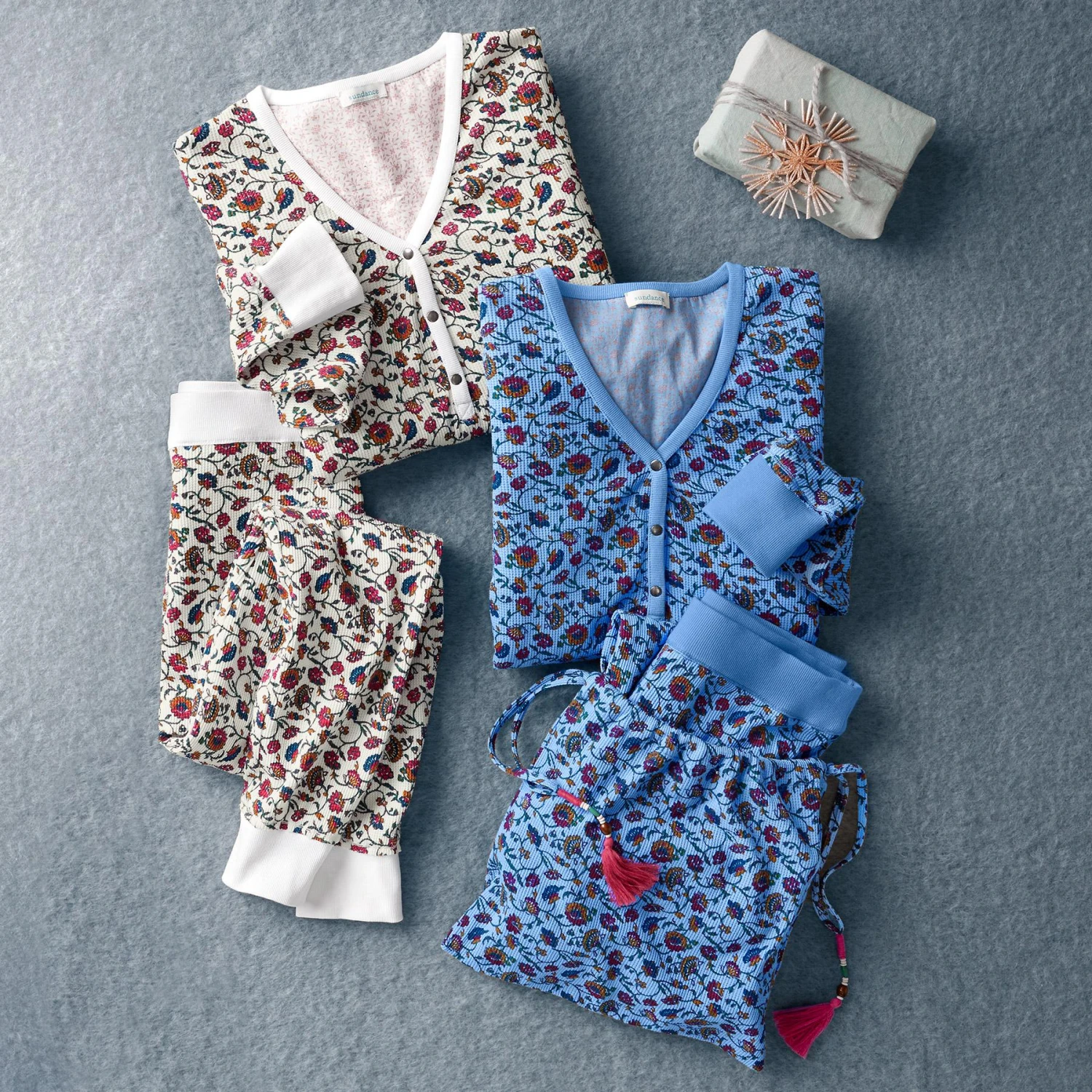 Cozy, overdyed thermal pajamas with elastic waist, rib cuffs. With novelty gift bag. Cotton. Machine wash. Imported. Exclusive. Sizes XXS (00), XS (0 to 2), S (4 to 6), M (8 to 10), L (12 to 14), XL (16 to 18). Top, approx. 23-1/2″L, Bottoms, 26-1/2″ inseam.