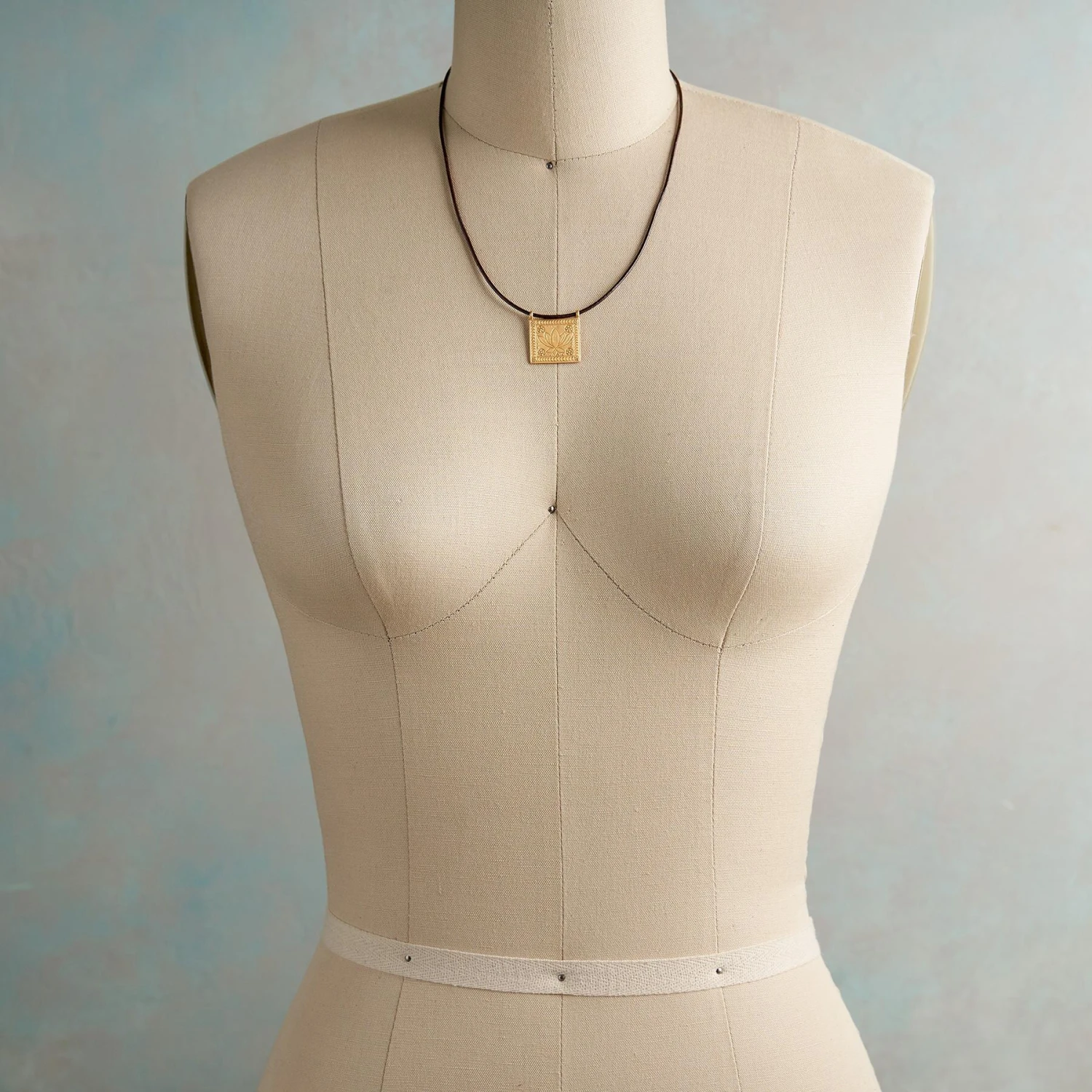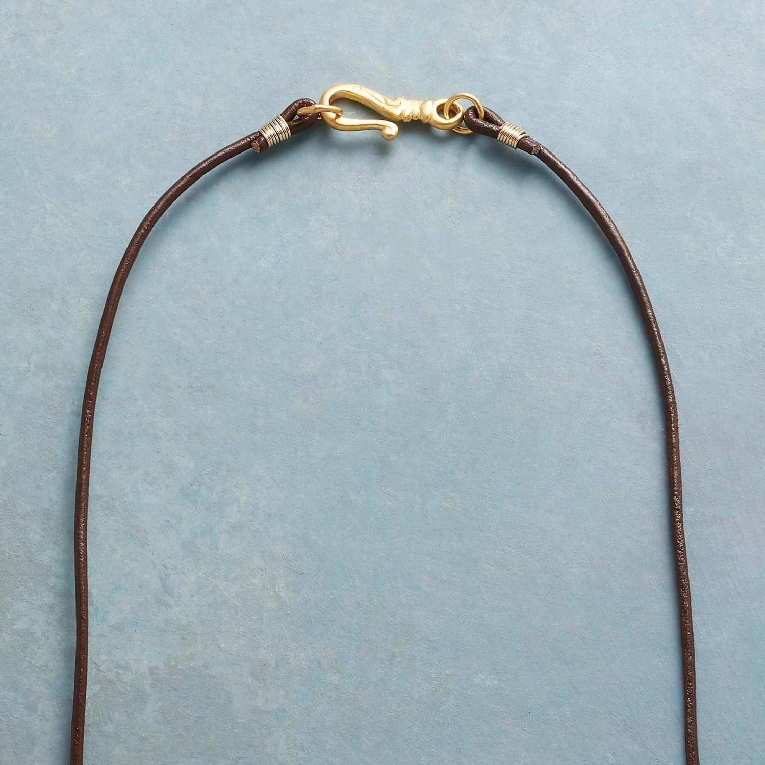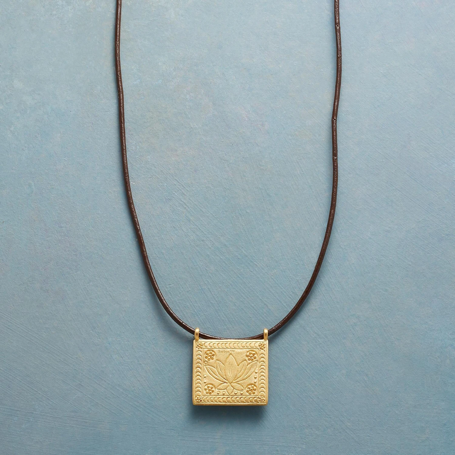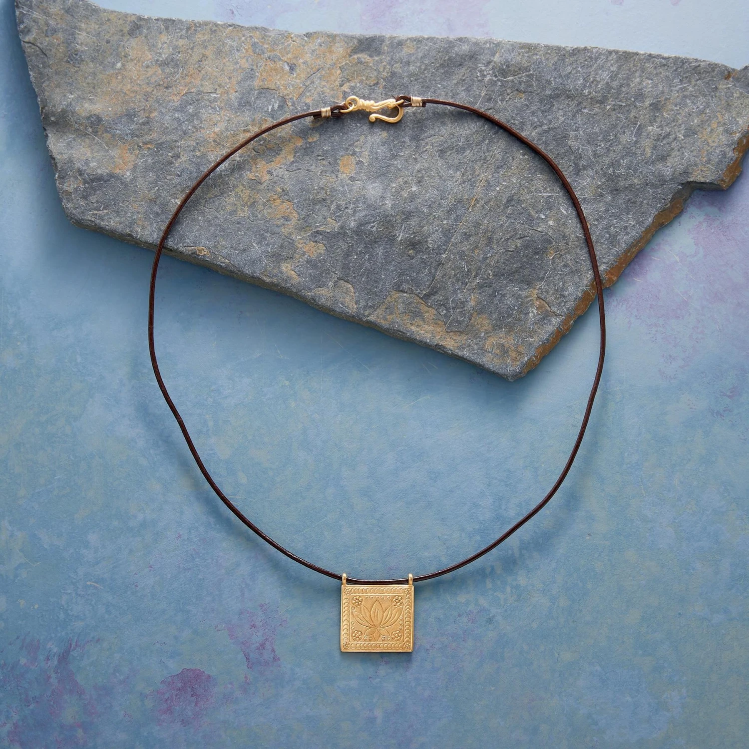 Symbolizing new beginnings, a singular lotus stamped in matte 18kt gold plate displayed on a leather strand. Exclusive. Hook clasp. 18″L.