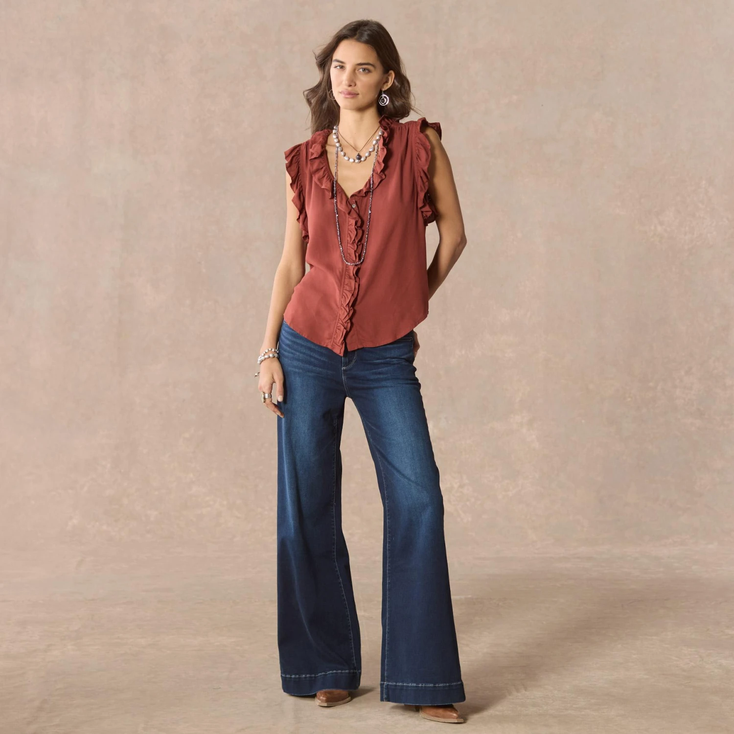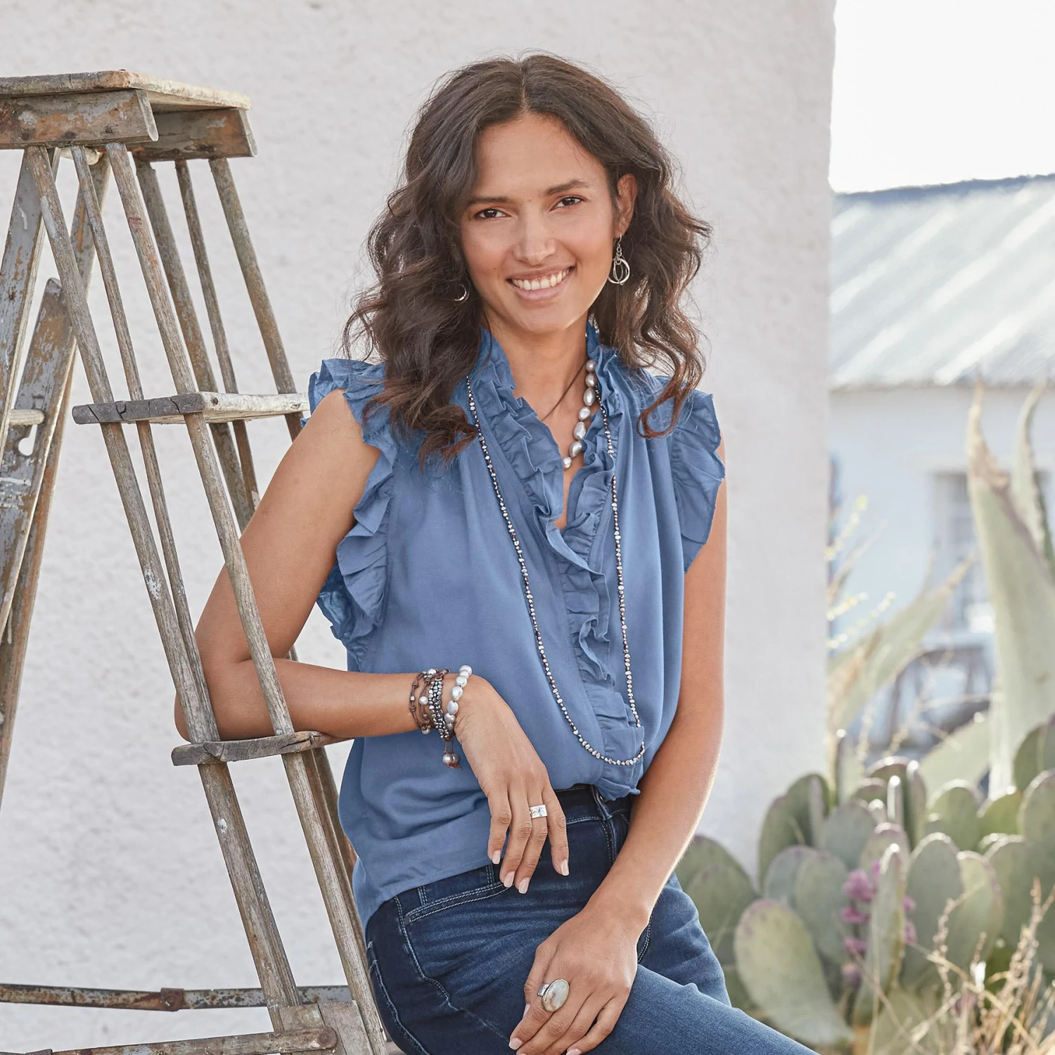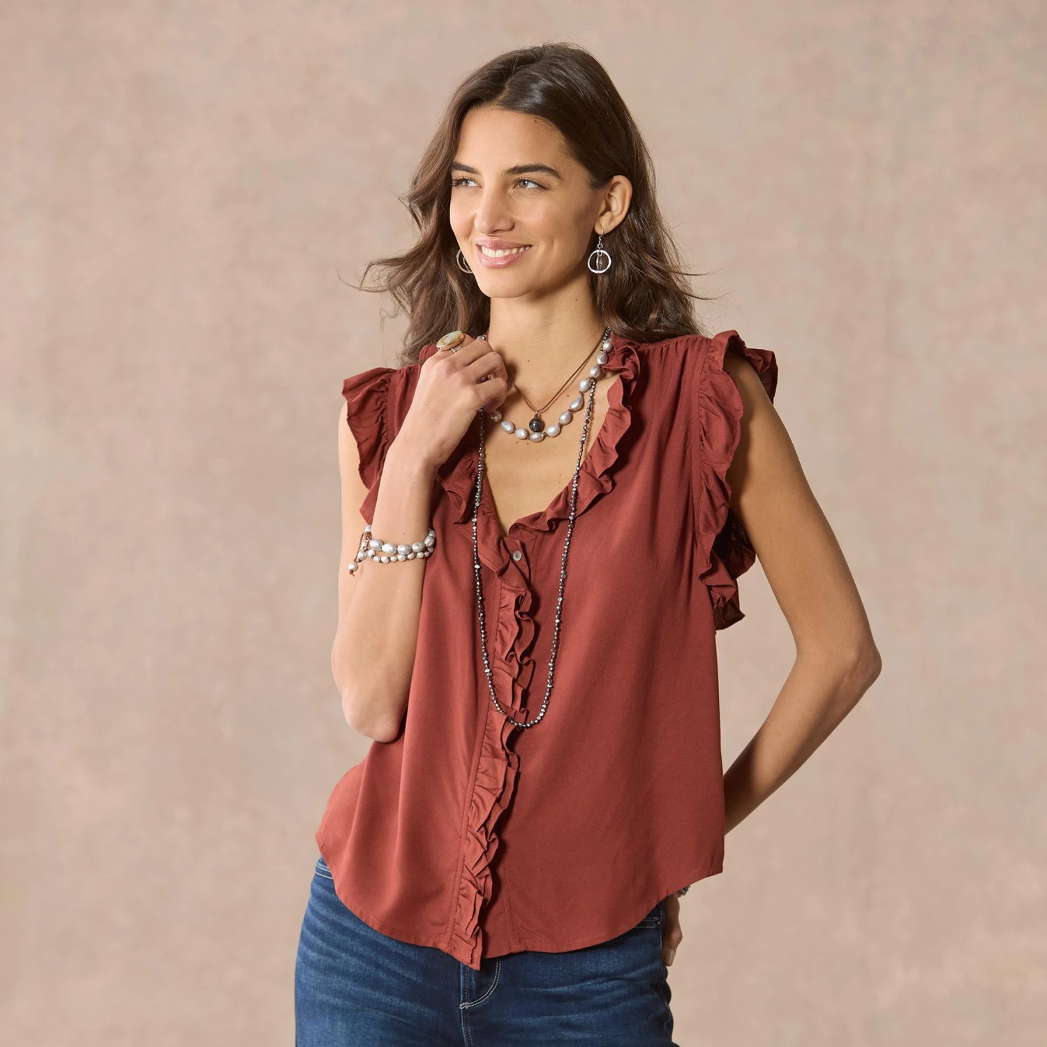 Flowing, easy-fit style with ruffles abounding. Hidden button placket. Rayon. Machine wash. Imported. Sizes XS (4), S (6), M (8 to 10), L (12), XL (14), XXL (16). Approx. 24-2/3″L.