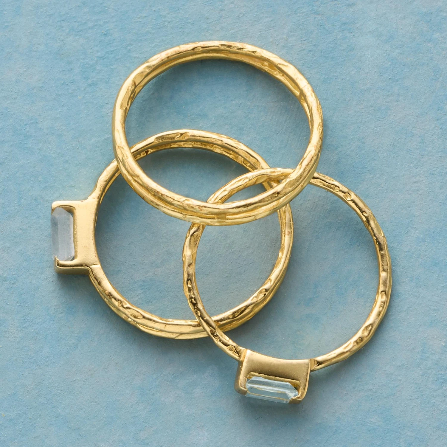Three ruggedly irregular bands look like more, as two are split for a doubled appearance. Handcrafted in 14kt vermeil with chalcedony jade and blue topaz baguettes. Exclusive. Whole sizes 5-9.