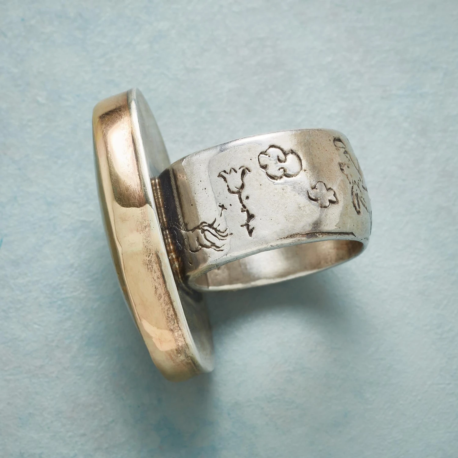 Set in 14kt gold by Jes MaHarry, a large Peruvian opal seems to glow from within. The wide sterling silver band is etched with whimsical drawings and the word “Life.” USA. Exclusive. Whole sizes 5 to 9.