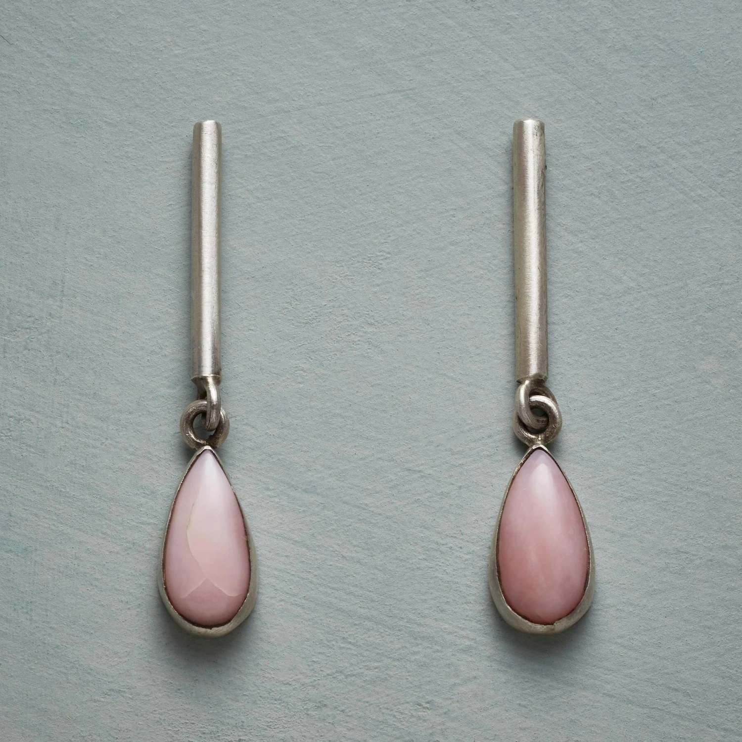 In these earrings, smooth pink opal teardrops punctuate sterling silver rods, the perfect finishing touch by Jane Diaz. Handcrafted. Posts. 1-3/8″L.