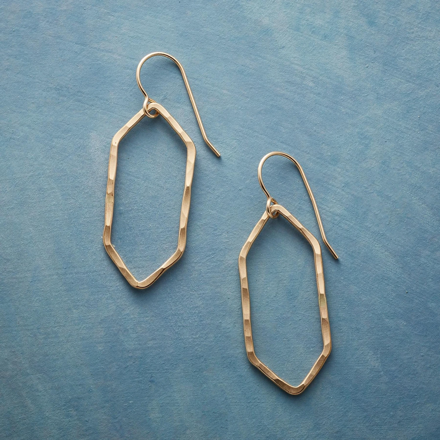 Long, dangling hexagons, a symbol of harmony and balance, bear the marks of hand hammering. In 18kt gold fill with French wires. Made in USA. 1-3/4″L.