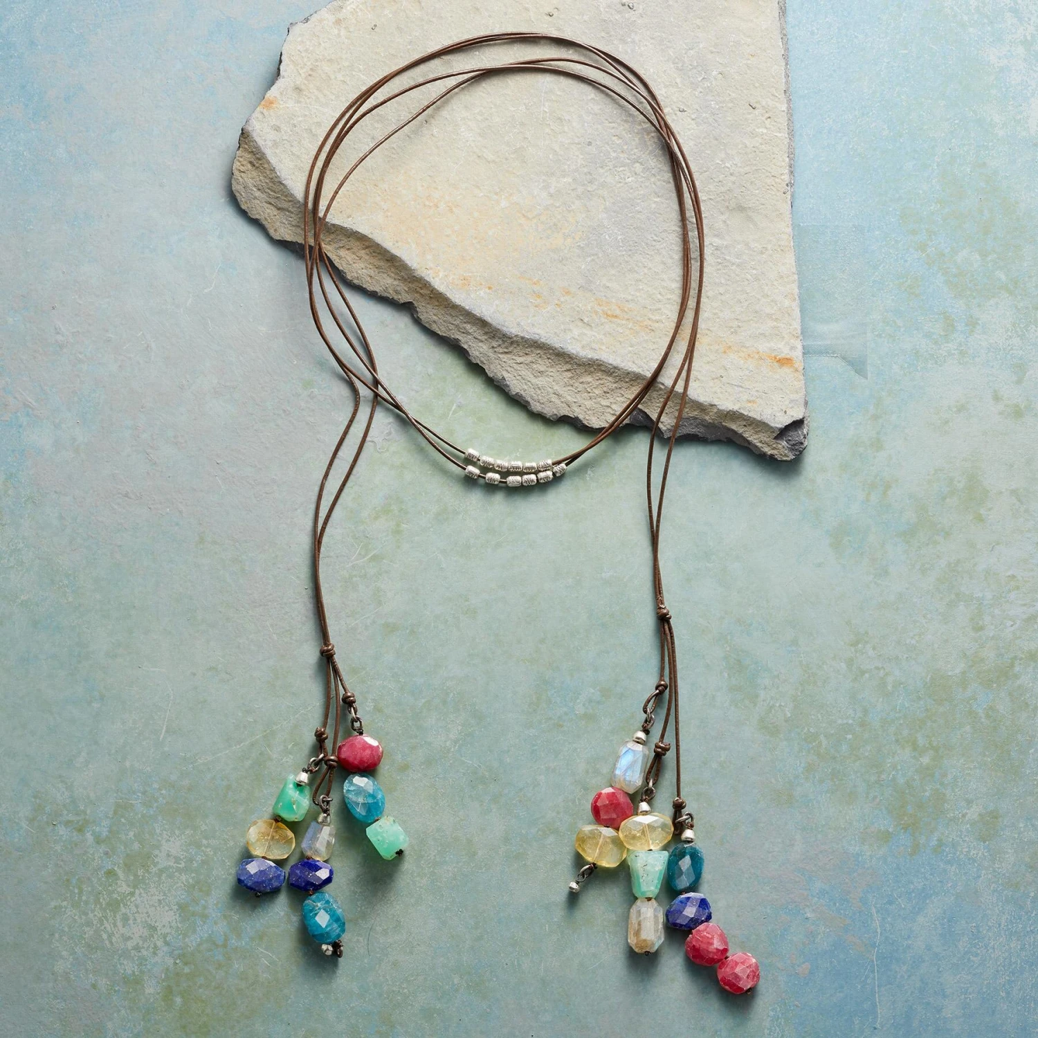 An abundance of colorful gemstones to wrap and tie as you choose. Leather lacing; Thai silver beads. Handmade. Exclusive. 38″L from end to end.