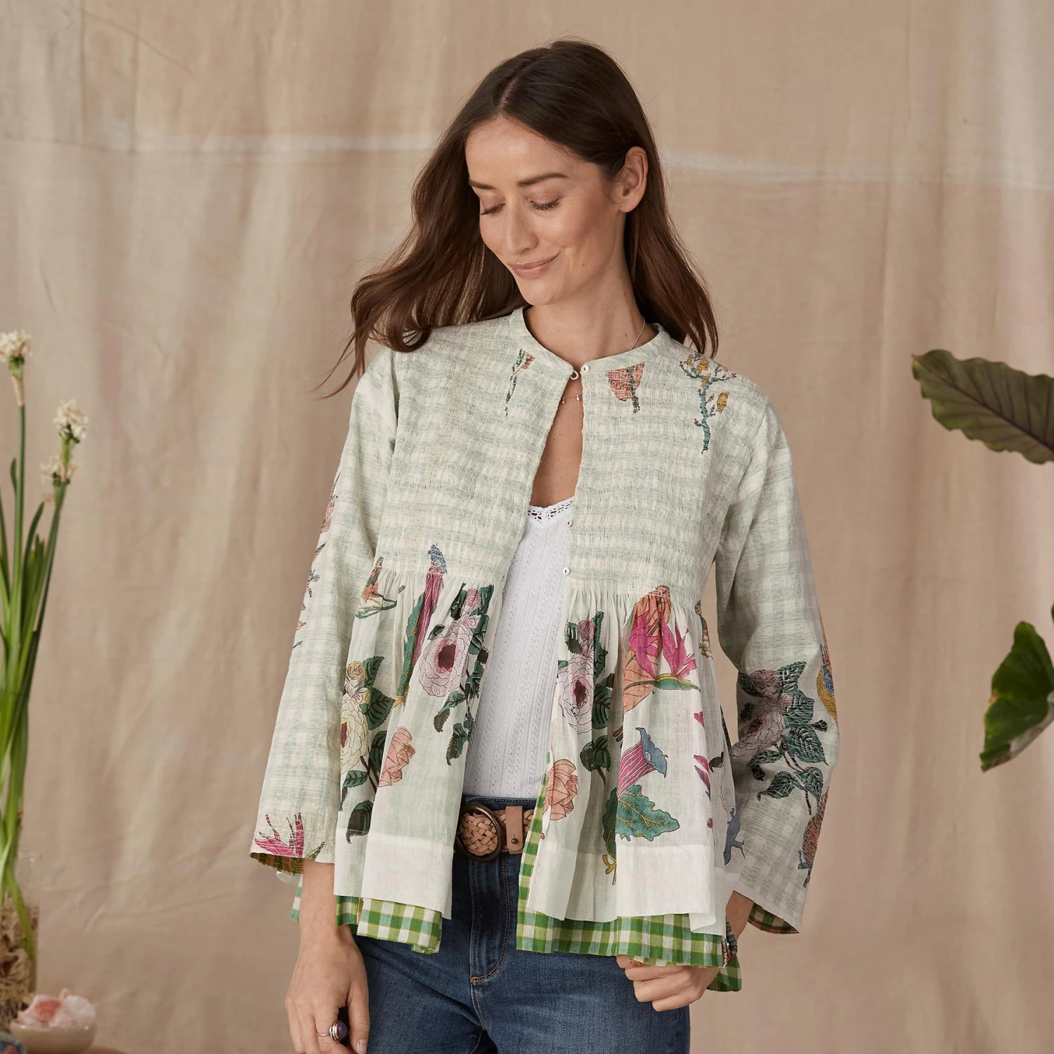 This exquisite piece is constructed of layered, hand-loomed fabrics that have been block printed and embroidered to stunning effect. Button closure, gathered yoke, swing hem. Cotton. Dry clean. Imported. XS (0 to 2), S (4 to 6), M (8 to 10), L (12 to 14), XL (16 to 18), XXL (20 to 22). Approx. 26″L.