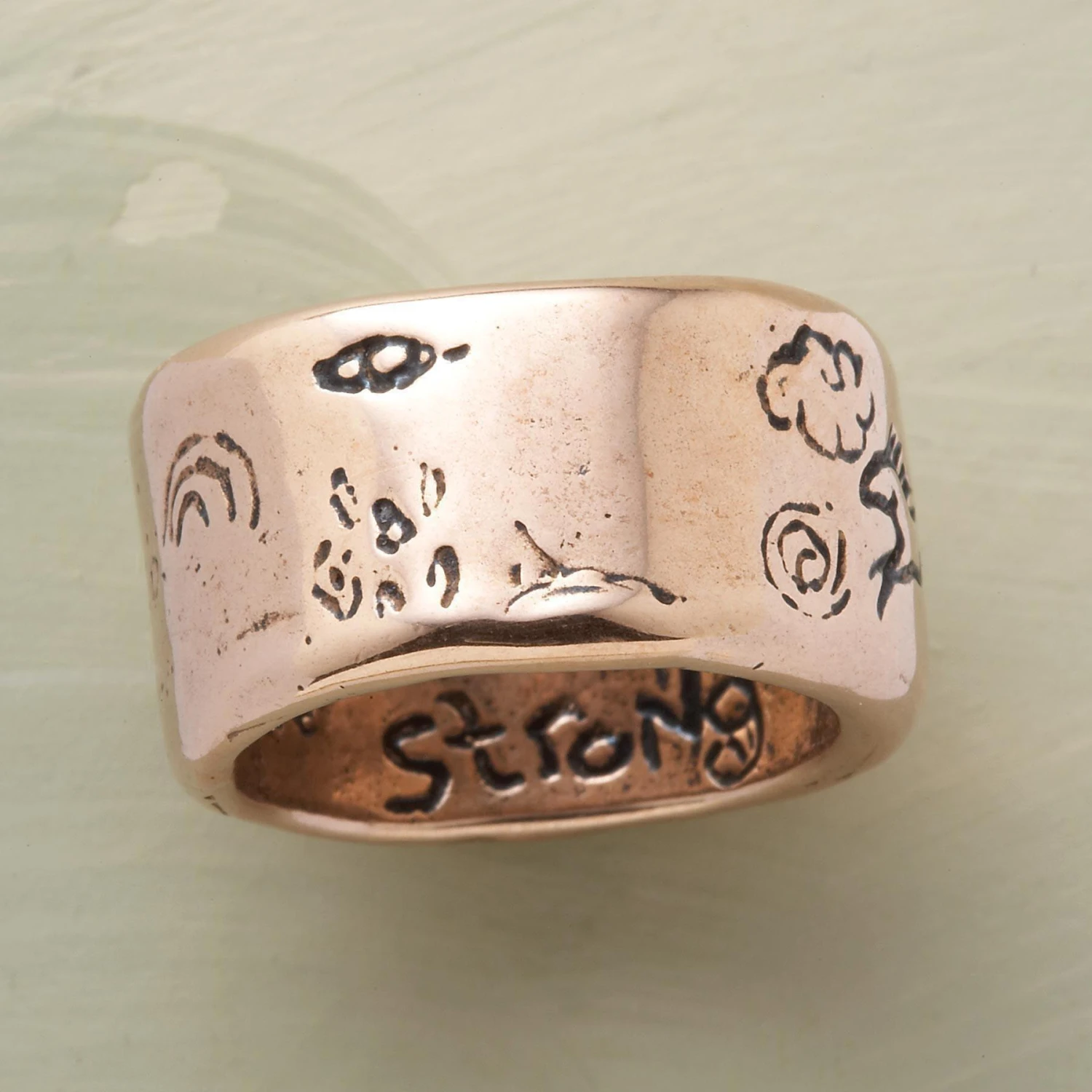 Our wonderfully hefty, 14kt rose gold strength ring is inscribed “Grow Strong” and signed by the artist, Jes MaHarry. Made in USA. Exclusive. Whole and half sizes 5-11-1/2. 1/2″w.