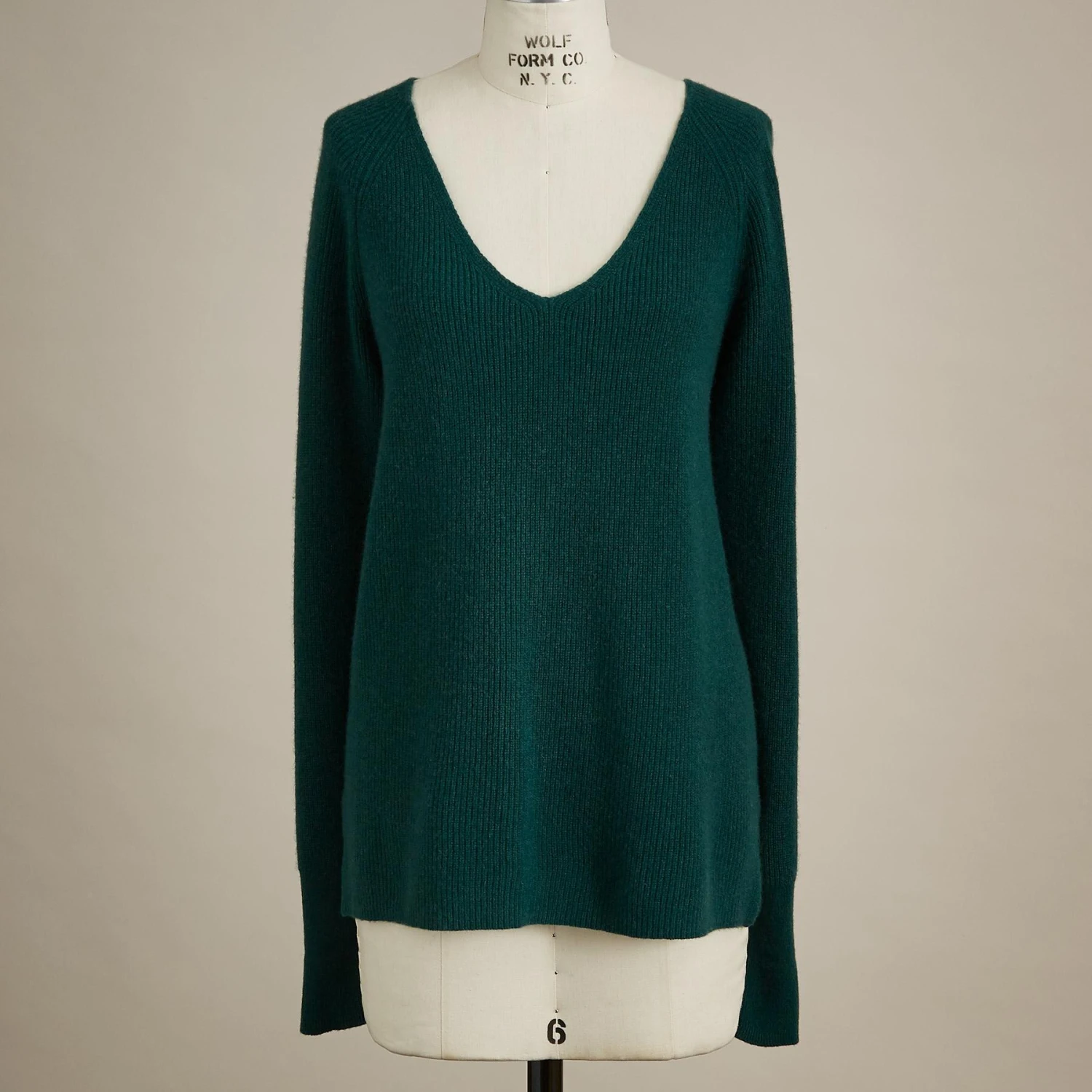 Easy elegance, delicate V-neck with rib detail, side slits. Cashmere. Hand wash. Imported. Exclusive. Sizes XS (0 to 2), S (4 to 6), M (8 to 10), L (12 to 14), XL (16 to 18), XXL (20 to 22). Approx. 25″L.
