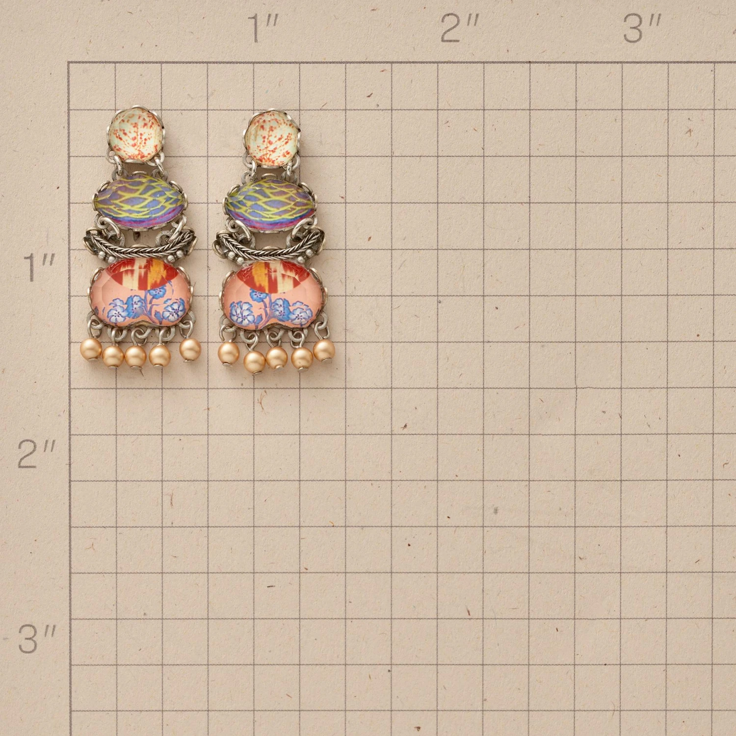 Faceted glass crystals, hand-set over printed fabrics create fantastical flower-filled gems. Trimmed with pearly baubles and set on silver-plated posts, these three-tiered earrings catch the light with every move. 1-3/8″L.