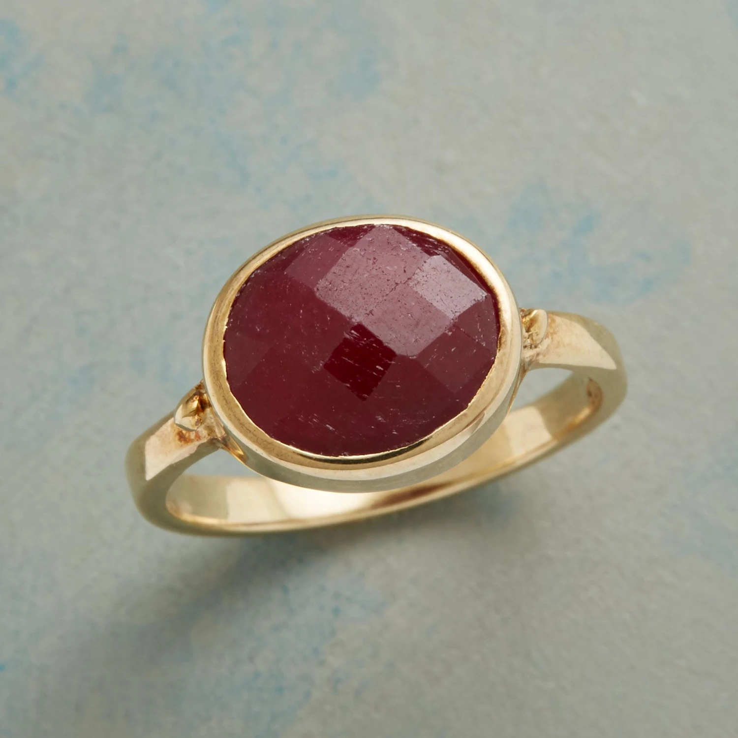 A simply sizzling ring with a faceted ruby, specially treated to bring out its fiery red, blazing on a 14kt gold plated ring. Exclusive. Whole sizes 5 to 10.