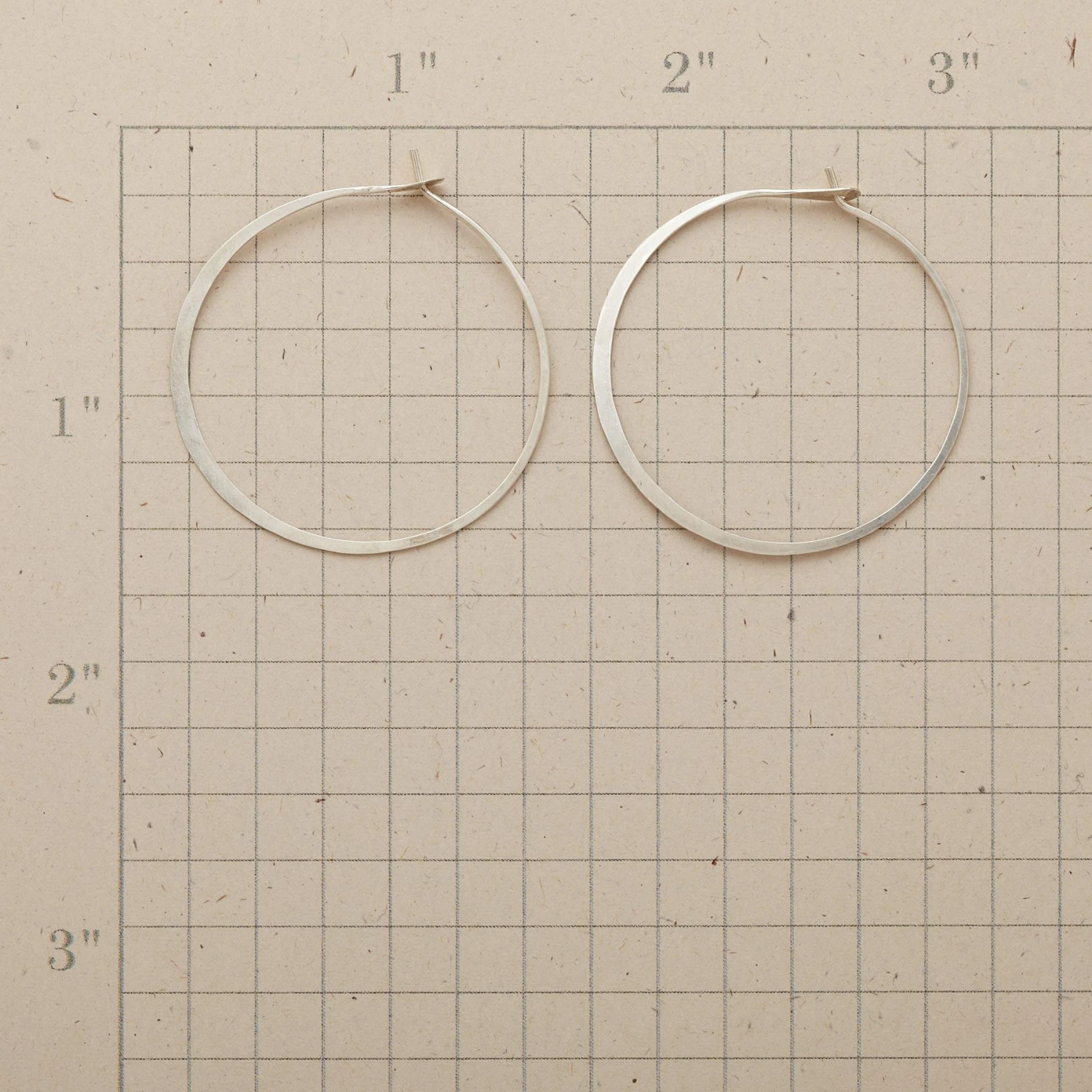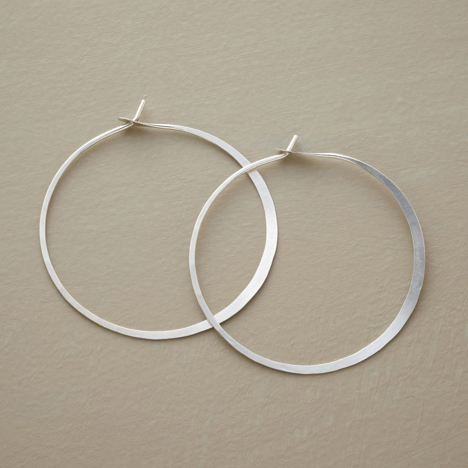 Large self-locking hoops are hand forged from a continuous length of wire to swell slightly as they round the curve. A Melissa Joy Manning design made in USA. Sterling silver. 1-1/4″ dia.