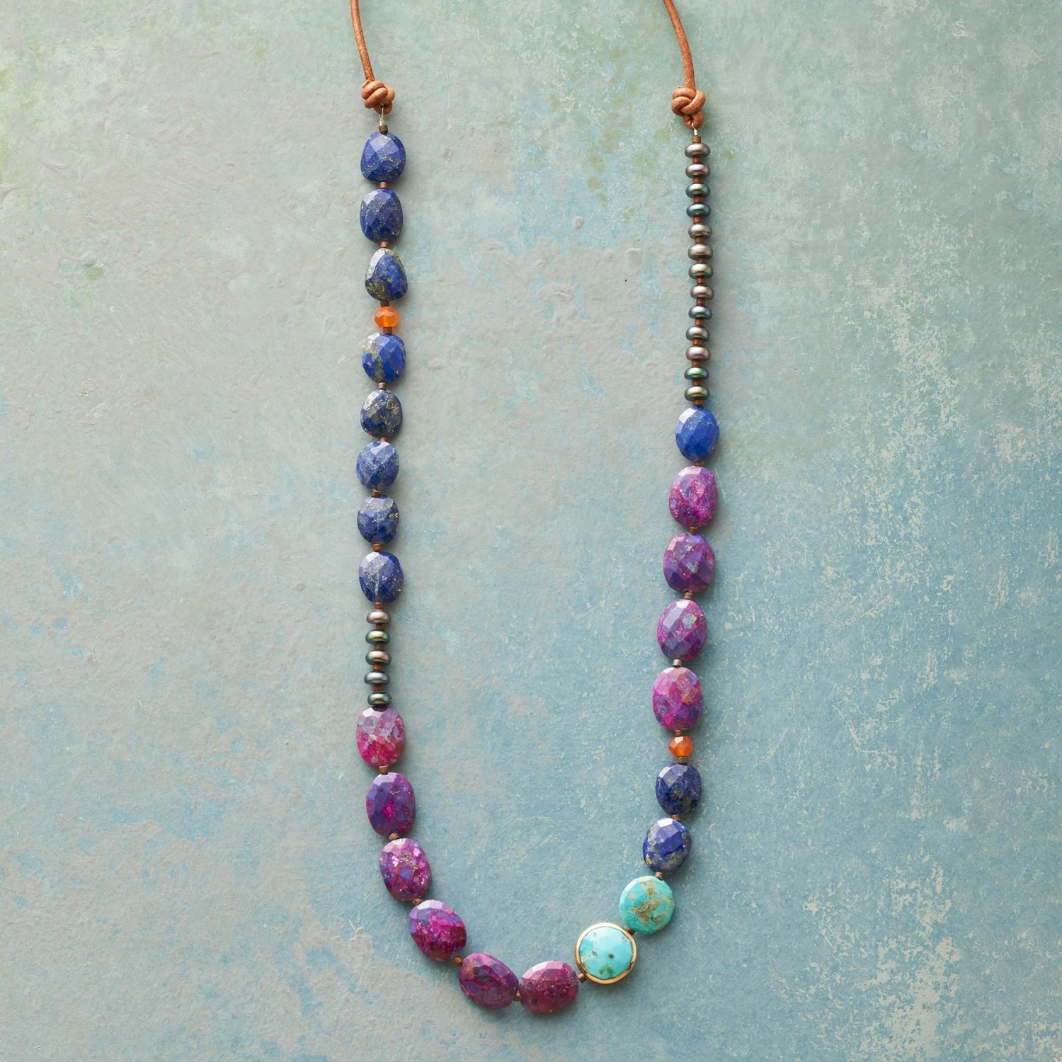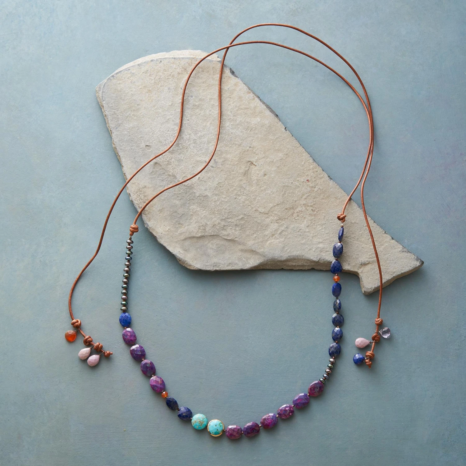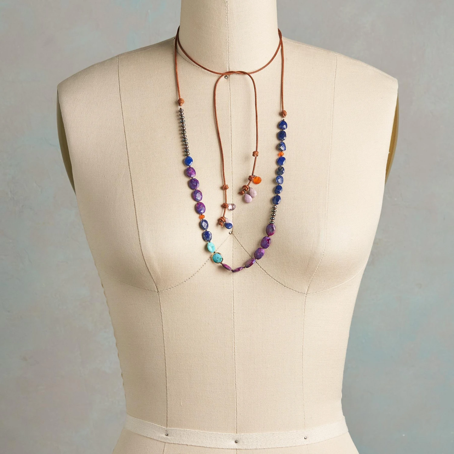 Turquoise tinted purple pops on a strand of lapis, tinted peacock cultured pearl and more. Turquoise centerpiece wrapped in 14kt gold plate. Exclusive. Handcrafted in USA. Tie leather laces to adjust length. 50″L.