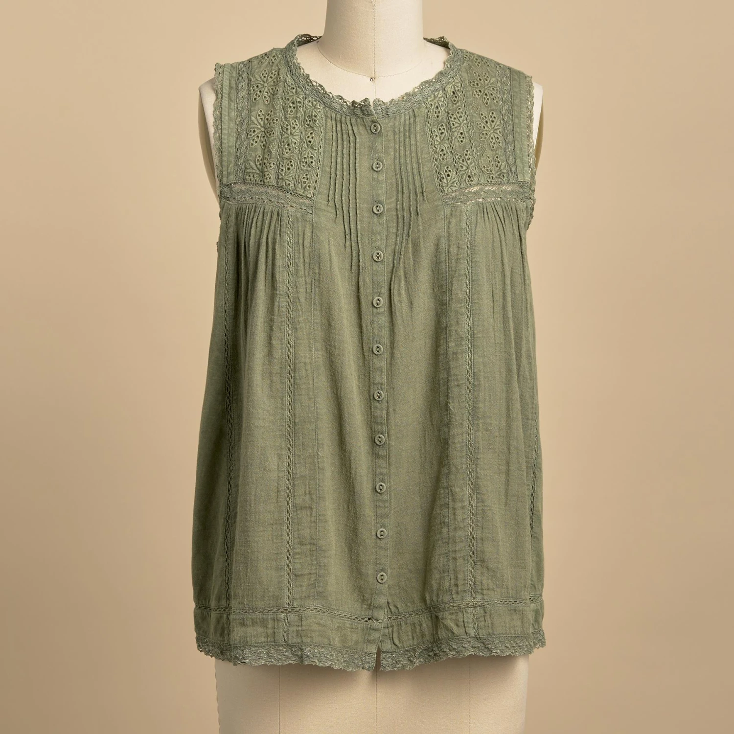 Laundry button-front, mixed knit and woven top with lovely A-line shape, lace and eyelet detail, pintucks, shirring. Cotton. Machine wash. Imported. Exclusive. Sizes XXS (00), XS (0 to 2), S (4 to 6), M (8 to 10), L (12 to 14), XL (16 to 18). Approx. 23″L.