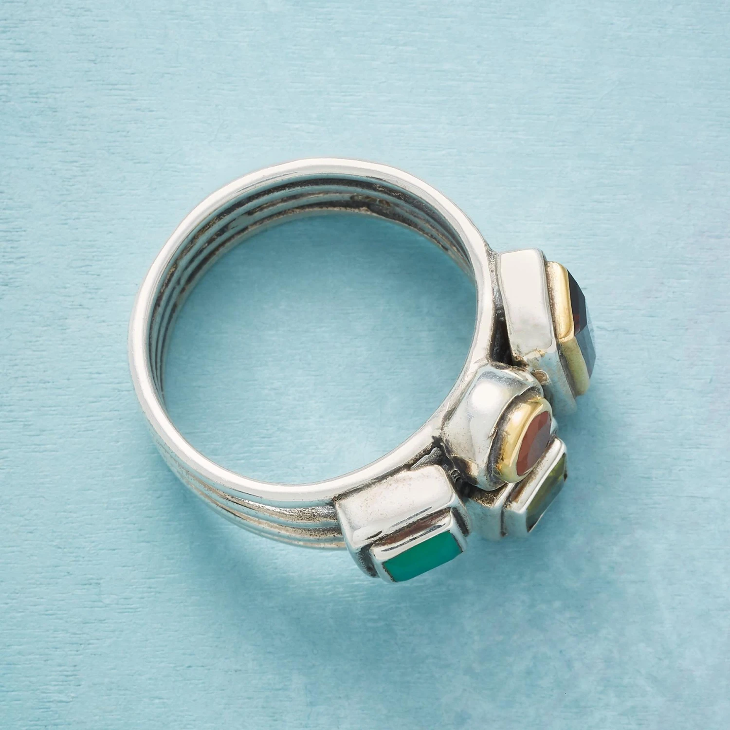 Gemstone mosaic spans a split shank, uniting chrysoprase and peridot with garnet and carnelian. Sterling silver with oxidized accents; two bezels aglow with 14kt gold plate. Whole sizes 5 to 9. Tapers 3/8″ to 1/4″W.