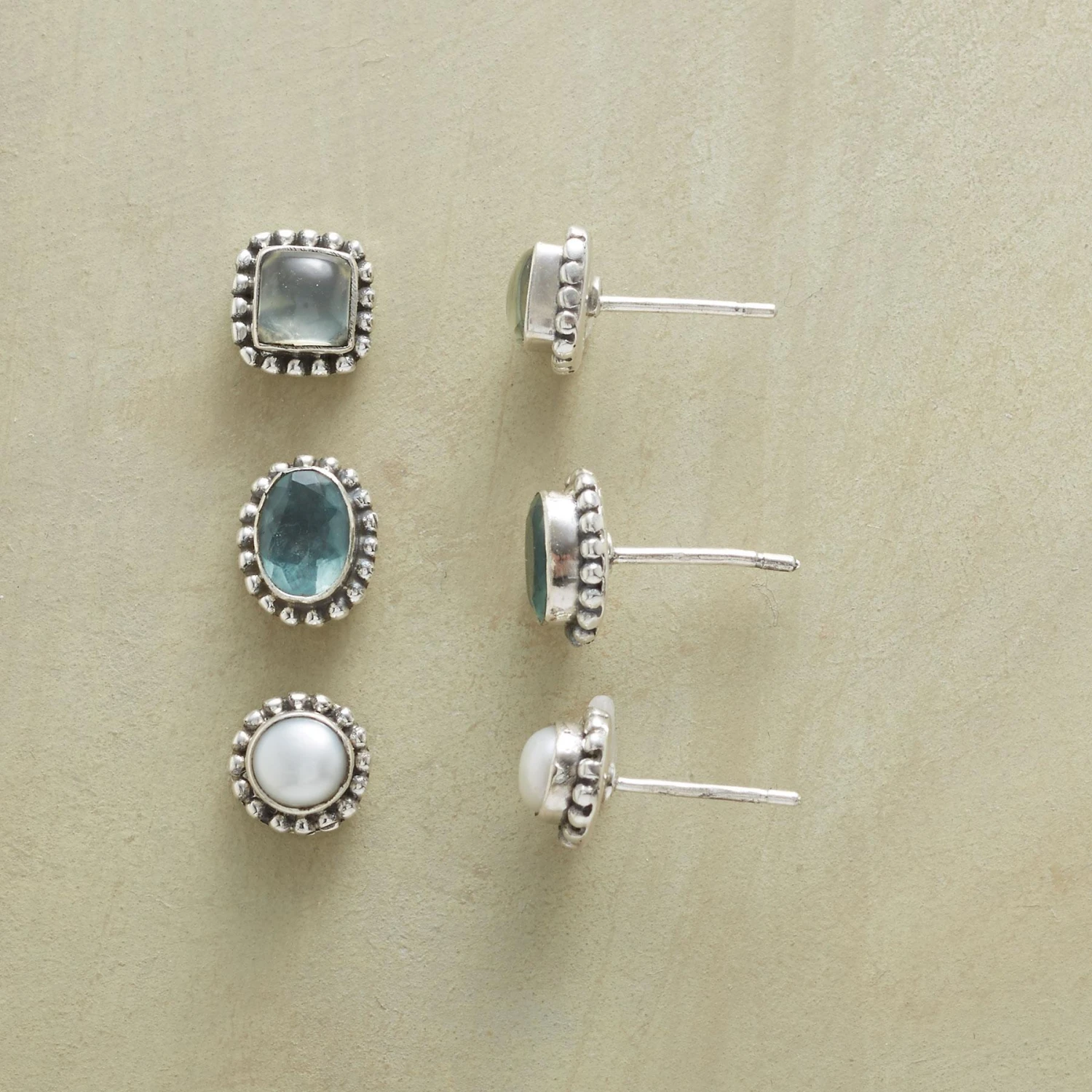 Framed in hand-worked sterling silver; prehnite, pearl and iolite offer three ways to look lovely. Exclusive. Set of 3. 5/16″–3/8″ dia.