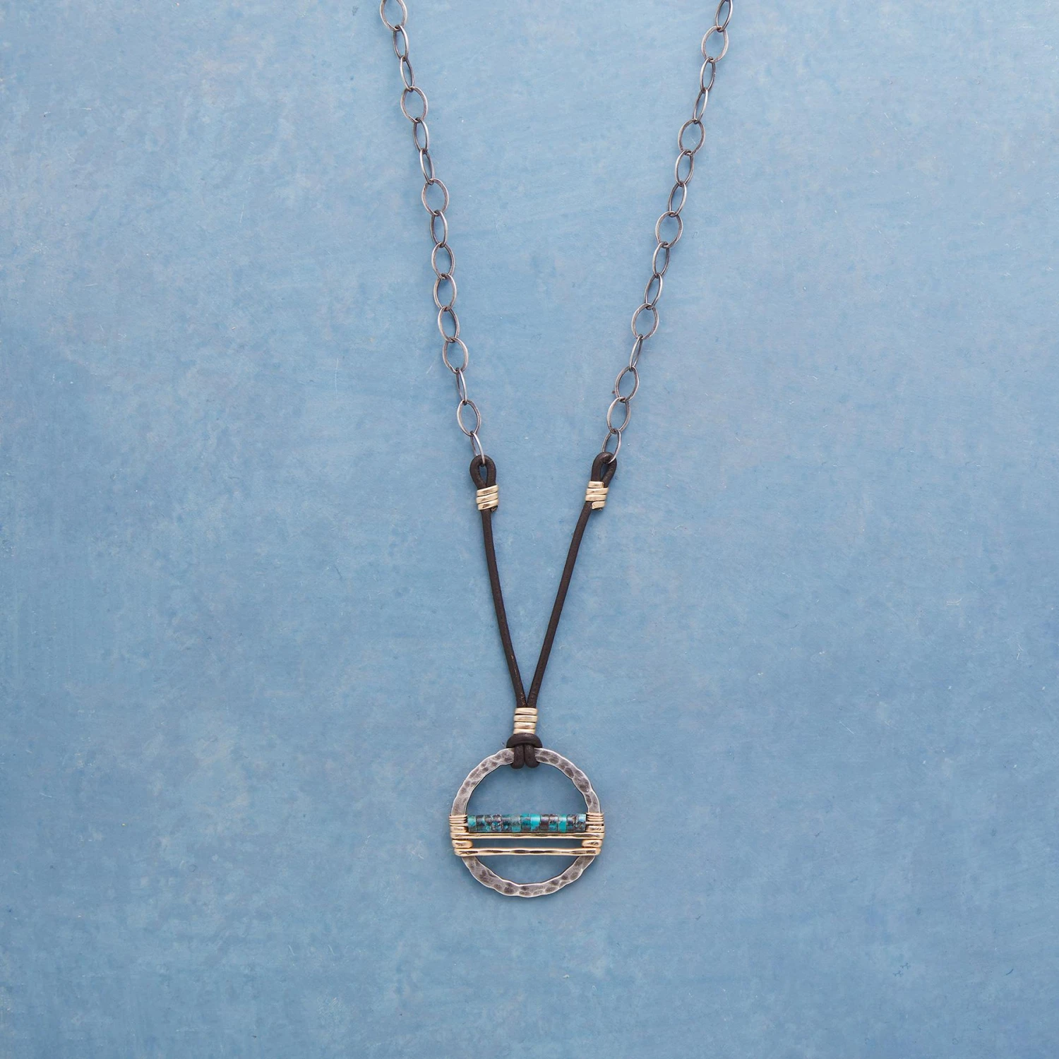 Turquoise heishi beads mark the midpoint; golden bars set the south aglow. Exclusive. Handmade in USA with leather laces, oxidized sterling silver, 14kt gold-filled accents. Lobster clasp. 22″L, 1-1/4″drop.