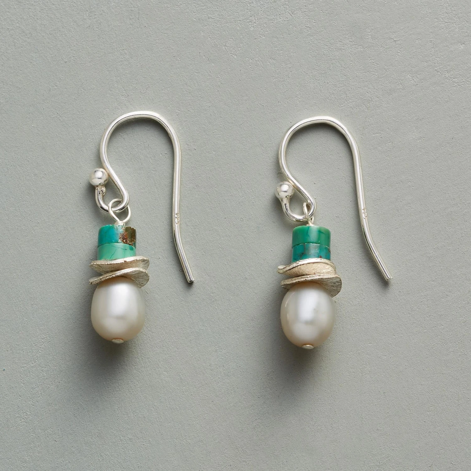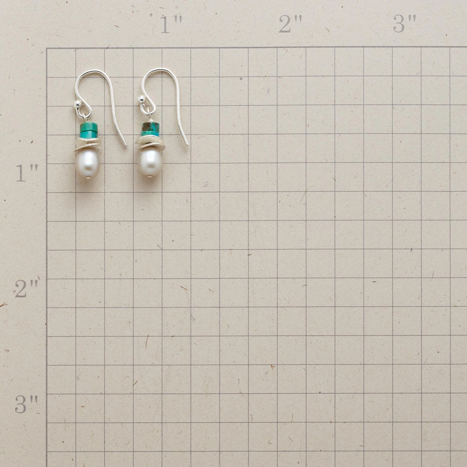 The freshwater pearls of our dangle earrings fall beneath a top hat of heishi turquoise beads and brushed sterling disks. Sterling silver wires. Made in USA. Exclusive. 7/8″L. Â